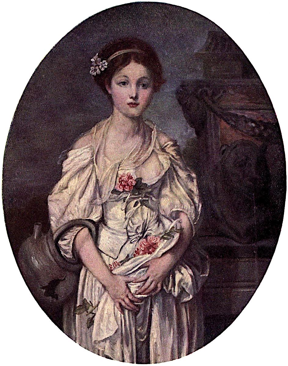 When we come to the great school of British portrait painting, we have to record at least two or three masterpieces worthy of being included in a great museum. A picture of unquestioned authenticity and great charm is the Portrait of Master Hare (No. 1818b) by Sir Joshua Reynolds (1723–1792), who in this, as in other similar pieces, proved himself the painter par excellence of childhood in all its innocence and ingenuousness, even though this306 picture is by no means impeccable as regards draughtsmanship. The Master Hare was bequeathed to the Louvre by Baron Alphonse de Rothschild in 1905. The badly repainted Portrait of a Lady (No. 1818a) in a white dress, and with powdered hair, is certainly not the work of Sir Joshua, under whose name it figures in the catalogue.