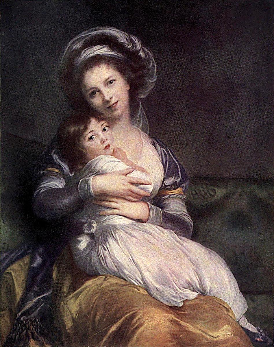 The artist, in a white bodice with purple sleeves and a yellow satin skirt, is seated on a green sofa. Her head is inclined towards her right shoulder. She presses towards her, with both arms, her little girl, who is resting on her lap, with her head turned towards the spectator.