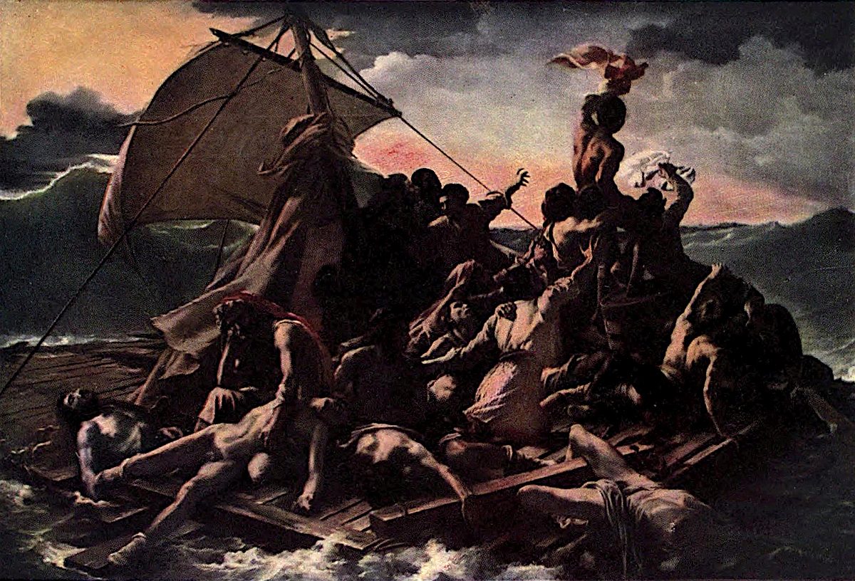 The raft of the wrecked Medusa, with the survivors of the crew, is floating on the stormy sea. In the foreground on the left, surrounded by dead sailors, a father is holding with his left hand the nude body of his dying son. On the right, a corpse is partly resting on the raft, partly floating on the water. Farther back the officer, Corréard, is seen pointing out to the surgeon, Savigny, the brig Argus, which appears on the far horizon under the clouded sky. At the far end of the raft a mulatto and a sailor have hoisted themselves on to some barrels to wave some rags, so as to attract the attention of the distant ship.
