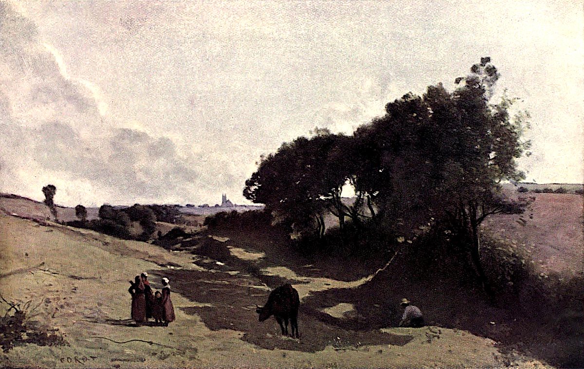 The term “Barbizon school” has been extended from its narrower meaning, in which it merely comprises Rousseau, Diaz, Millet and the disciples who joined them, to form a little artistic colony on the edge of the Forest of Fontainebleau, to a less accurate but now generally accepted wider application, embracing “the men of 1830,” who collectively and individually set out, inspired indirectly by Constable, upon the conquest of light and atmosphere through intimate communion with nature. In a pedantic survey of this Barbizon school, Rousseau would have to take honour of place as the leader of the group, whilst Corot and Daubigny, neither of whom actually worked at Barbizon, would have to be altogether excluded. But in the more liberal interpretation of the term, which we have here adopted, Jean Baptiste Camille Corot (1796–1875) must be given first place as the doyen of the whole group, since he alone was born before the eighteenth century had run its course.