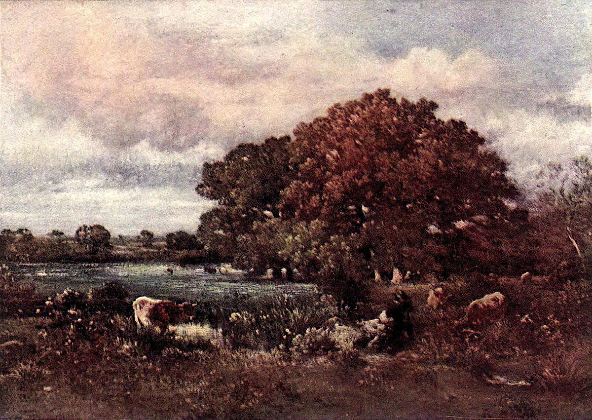 Jules Dupré (1811–1889) began, like Troyon, as a china-painter, and, like Rousseau, with whom he was for years on terms of intimate294 friendship, benefited by the example of Constable, whose art he had presumably occasion to study during a visit to England. It was from him that he acquired the sense of movement in nature, which is so much more pronounced in his landscapes than in Rousseau’s, whom he exceeded in breadth of touch and in power. More particularly in his later manner he loved to apply his colours in a thick impasto laid on to every part of the canvas, including the sky. Only on rare occasions did he adopt the more fluid, suave manner shown in Morning (No. 2940) and Evening (No. 2941), the two decorative panels executed for Prince Demidoff, and acquired by the Louvre in 1880 at the San Donato sale. More typical of his virile, forceful style are the twelve signed pictures by Dupré in the Thomy Thiéry Bequest (Nos. 2864–2875), especially the fine autumn landscape The Pond (No. 2867, Plate L.), the intensely sad, sunless Flock in the Landes (No. 2871), The Large Oak (No. 2873), and The Sunset on a Marsh (No. 2874), with the golden glow of the sky reflected in the water.