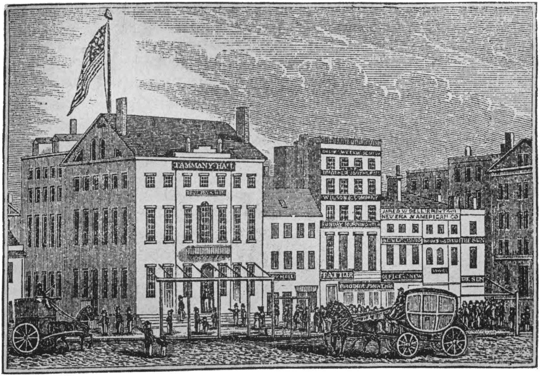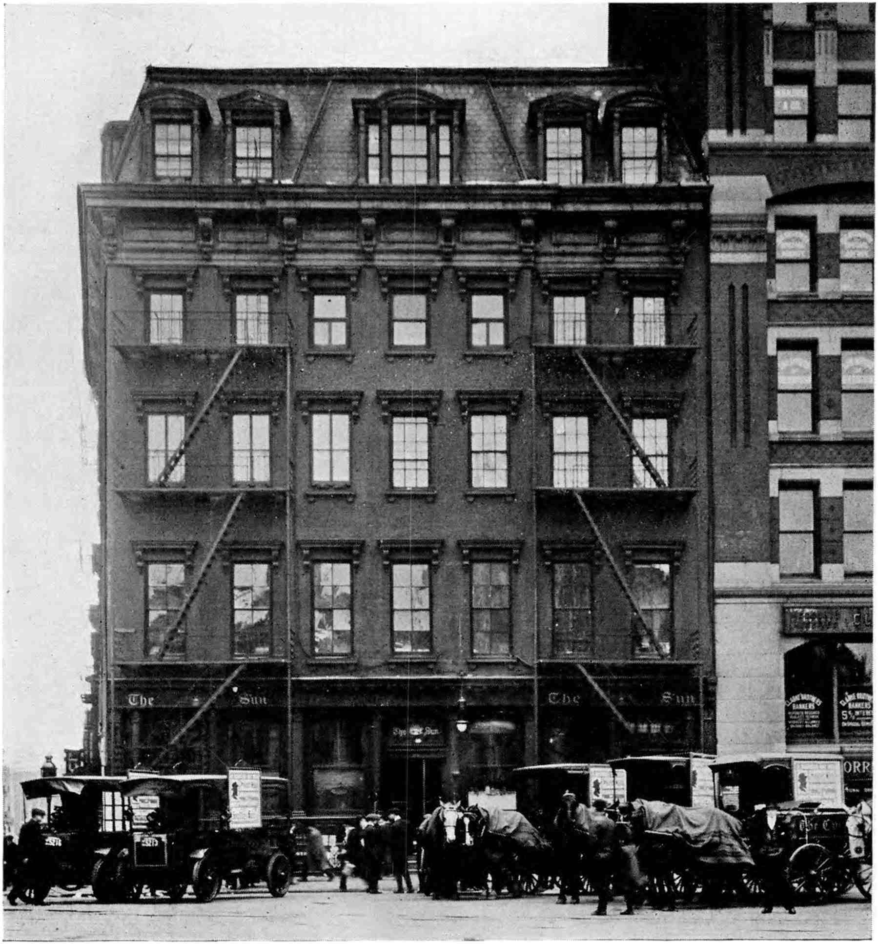 The Sun has had five homes—at 222 William Street, where Benjamin H. Day struck off the first tiny number; at 156 Nassau Street, rented by Day in August, 1835, when the paper began to pay well; at the southwest corner of Nassau and Fulton Streets, to which Moses Y. Beach moved the Sun in 1842; at Nassau and Frankfort Streets, the old Tammany Hall, which Dana and his433 associates bought; and at 150 Nassau Street, whither the Sun moved in July, 1915. It is expected that the Sun will presently move to another and a fine home, for in September, 1917, Mr. Munsey bought the Stewart Building, at the northeast corner of Broadway and Chambers Street, just north of City Hall Park. The site is generally admitted to be the most desirable building site downtown, so large is the ground space, so fine is the outlook over the spacious park, and so close is it to three subways, three or four elevated-railroad lines, and the Brooklyn Bridge.