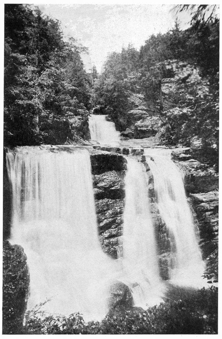 In 1780 Andrew Montour, leader of an Indian party, captured the Gilbert family, twelve persons, and took them over Mauch Chunk and Broad Mountains into{466} the Nescopec path, across Quakake Creek to Mahoning Mountain and over wild and rugged country to Canada; eventually they were all redeemed at Montreal, in 1782, and returned to Byberry. A view of great scenic beauty is from Prospect Rock, over the Nescopec Valley; Cloud Point, frequently covered by vapor, may be seen; near is Glen Thomas with a picturesque Amber Cascade, named for David Thomas, pioneer in the iron trade. Glen Onoko, two miles above Mauch Chunk, with its wild beauty, total ascent over 900 feet, forms the channel for the clear stream which flows over innumerable cascades to the Lehigh; the most noticeable are “Chameleon Falls,” fifty feet high, and “Onoko Falls,” ninety feet high, with overhanging rocks, covered with moss and ferns.