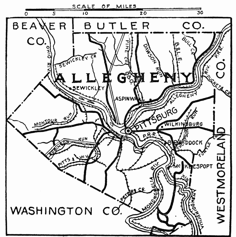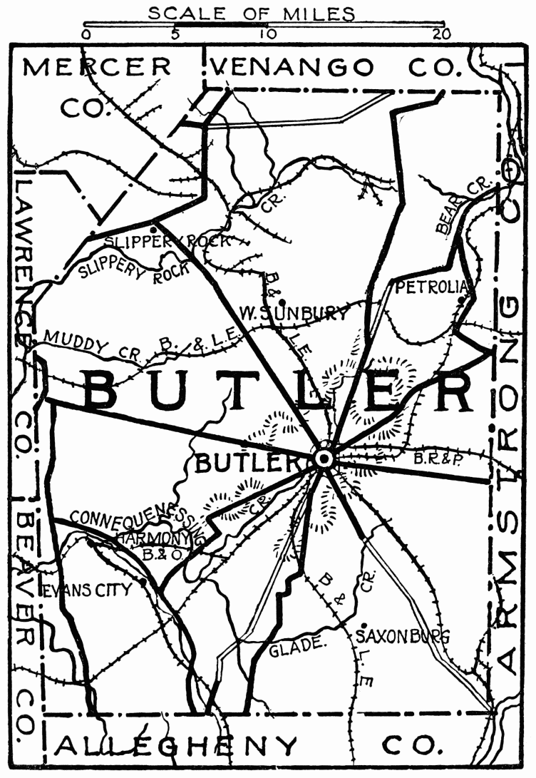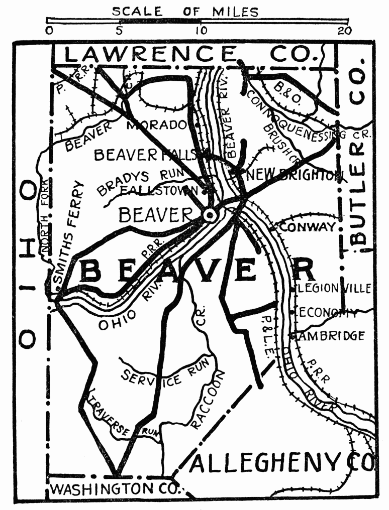 Cascade Park has great natural beauty. A part of the beautiful Slippery Rock is in the southeast of this county. At Mount Jackson is Battery B Monument in honor of the Round Head Regiment. New Wilmington, population 8861, has Westminster College, under United Presbyterian administration; near here was the McKinley blast furnace, owned and operated by President McKinley’s father. His son worked here as a boy.{489}