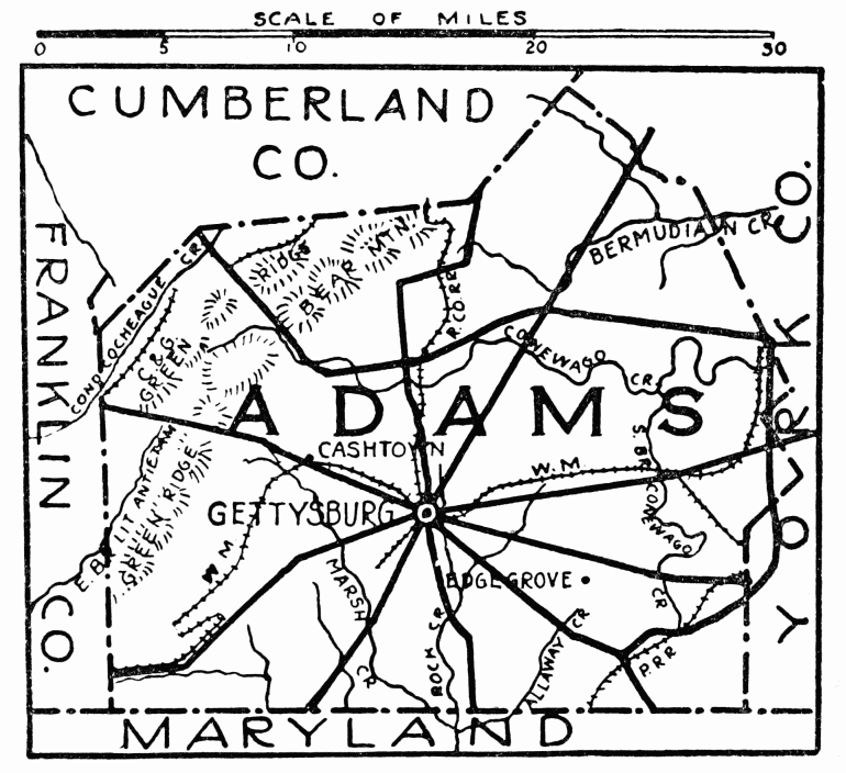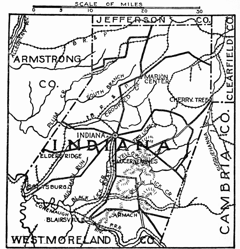 In the days following Braddock’s defeat in 1755, this region became the arena in which the red warrior of the forests and the white frontiersman fought to the death. Not a valley, creek, nor mountain range, site of modern city or town, but what was the scene of thrilling events, some of which influence the world for all time. Early settlers were Scotch-Irish, on the Aughwick, and in the great cove. Chief industries, iron ore, bituminous coal, and agriculture. Dickey’s Mountain, in the southeast, is rich in hematite and fossil ores.