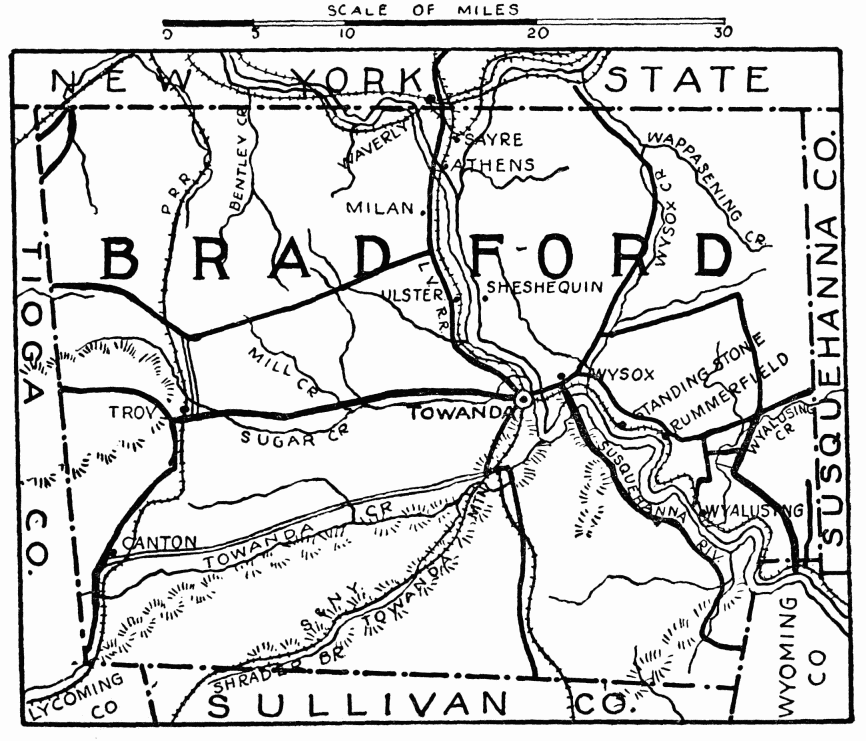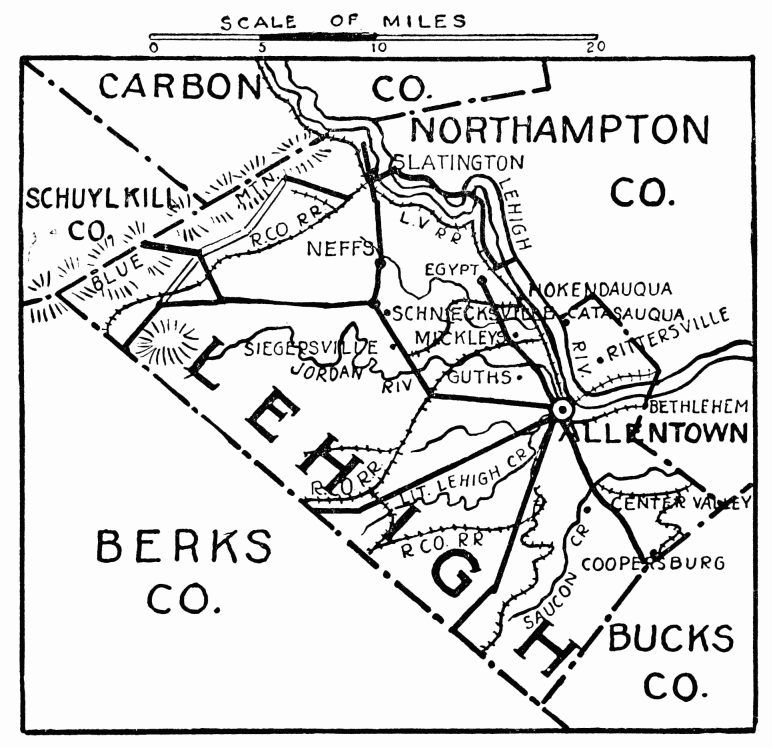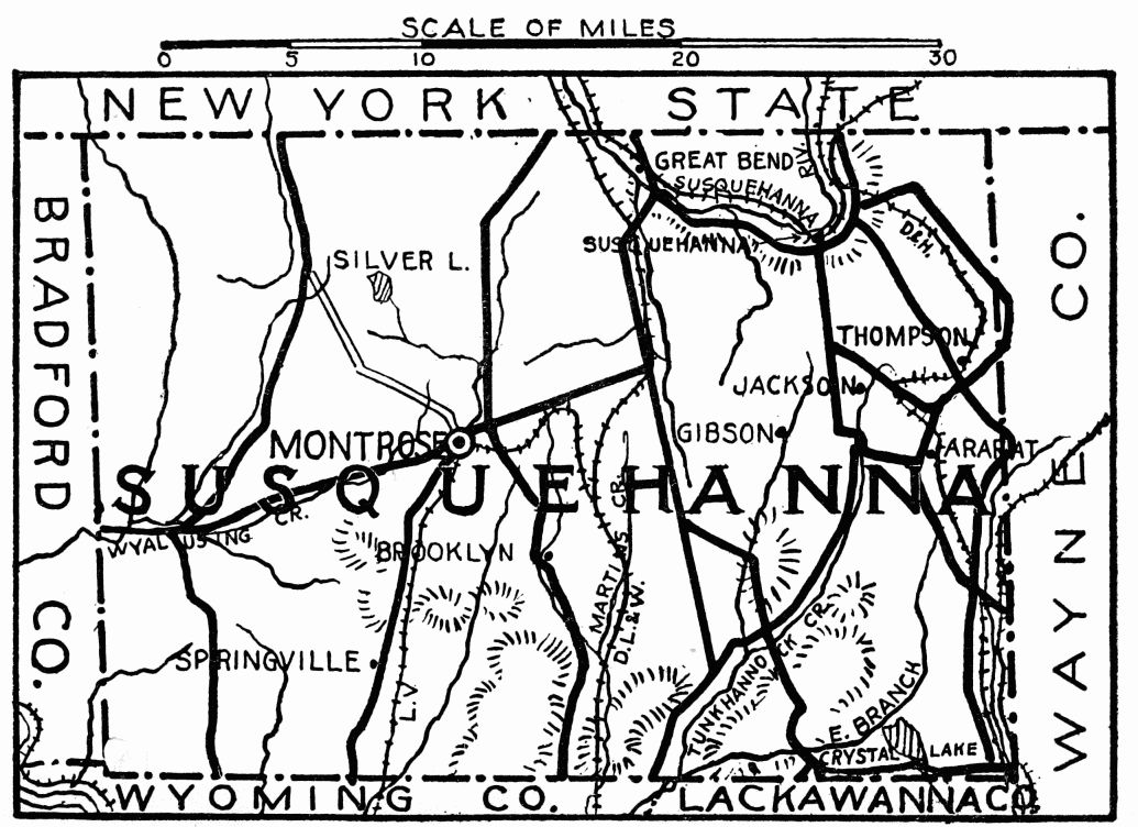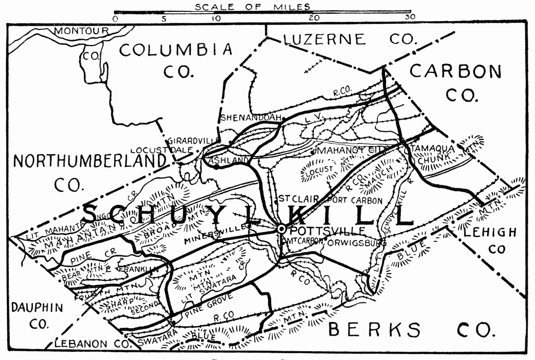 FORMED August 13, 1878; named for the great Lackawanna coal basin; an Indian word, signifying “The Forks of a Stream.” Chief industry, anthracite coal mining, confined to the long-depressed trough forming the Lackawanna Valley and to the mountains bordering it on both sides, with Bald Mountain, in Lackawanna Range, 2250 feet high, and Big Stoney among the Moosic Mountains, 2230 feet. Originally settled by Connecticut people who disputed the right of Pennsylvania to jurisdiction; life and growth have been the result of the coal-mining industry, which brought into it large numbers of Welsh, Irish, German, English, and Scotch, whose descendants dominate the region; latterly have come Polish, Slavs, Italians, and Lithuanians, a heterogeneous but rapidly assimilating mining population.