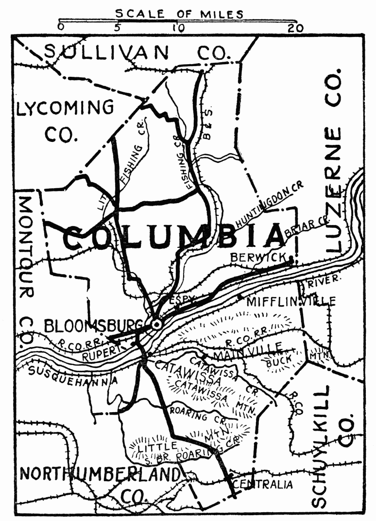 Two miles west is Salem; Row’s Church, log, built, 1780, modernized in 1897. In Kreamer is the old brick hotel used for special sessions of court before 1855, for cases in immediate neighborhood; a short distance in the field stands the old block house, erected before 1781, where white settlers gathered in defense against Indians. One mile farther west, in 1781, Indians killed five members of the Stock family. Ten miles west from Selinsgrove is Middleburg, county seat; 498 feet above sea level; population 984; laid out in 1800. In Glendale Cemetery is grave of Hon. George Kreamer, nephew of Governor Snyder, and member of the Legislature, 1812-13; member of Congress, 1823-27; also grave of Captain Frederick Evans, member of State Legislature, 1810-11, a defender of Fort McHenry, Baltimore, where, in 1814, the “Star-Spangled Banner” was written by Francis Scott Key.{498}
