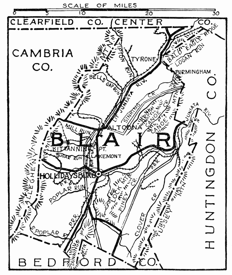 FORMED February 26, 1846; named for Honorable John Blair, native of this county, and public-spirited citizen; in 1820, he laid out, and was President of the Huntingdon, Cambria and Indiana Turnpike, first in this section. Blair County lies in the beautiful Juniata Valley, settled by Scotch-Irish, English, and Germans; much of the soil is very fertile. Chief industries, agriculture, coal mining, and manufacturing. It is the center of a network of roads, mostly built as turnpikes from 1830-50; now state roads.