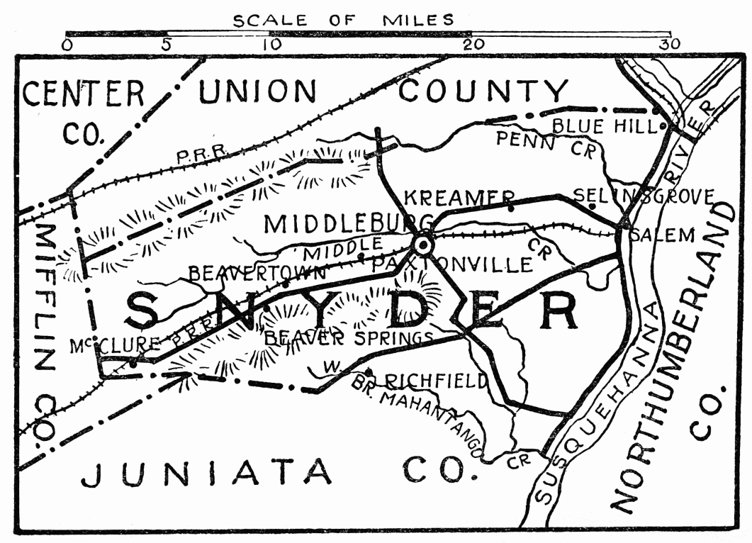 FORMED March 2, 1855, named for Hon. Simon Snyder, Governor of Pennsylvania, 1808-17; three terms; noted as the first governor to urge legislation for free public schools; he was the great war governor of 1812; served in the Assembly from 1789-1808, and was speaker of the House from 1802-08; he lived at Selinsgrove. From end of Northumberland Bridge, built by Theodore Burr in 1814, on West Branch of the Susquehanna; the road leading south to Selinsgrove passes Blue Hill, noted for beautiful scenery. On top was formerly Hotel Shikellimy, burned in 1895; on one of the rocks overhanging is a natural profile named for Shikellimy, who sauntered about here. Farther on is a single arch stone bridge; for half a mile, beginning at this bridge, is a state road built by the Commonwealth of Pennsylvania. Governor Pennypacker handled the first shovel of dirt in 1904; it was laid out first by James F. Linn in 1829, has since been extended.