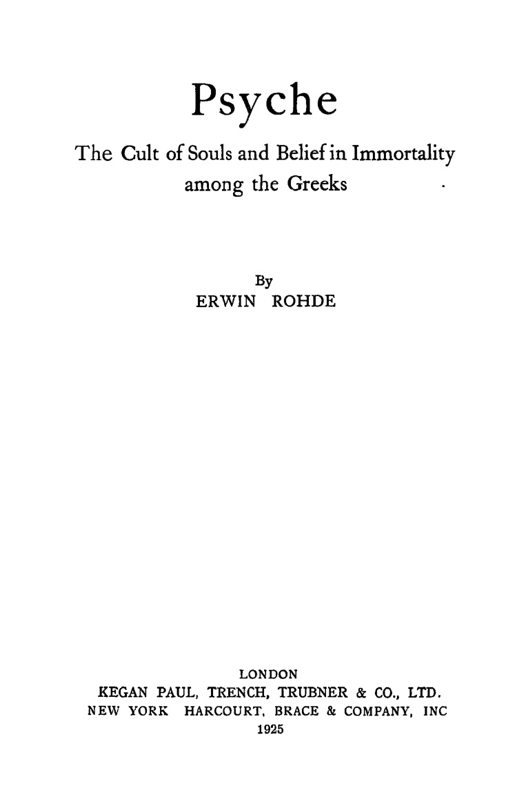 IN supervising together this reprint of “Psyche” we have found ourselves faced with the question which Schöll and Dieterich had to decide in bringing out the third edition—whether changes or additions would be admissible. It went without saying that the text must remain untouched in the form last given to it by Rohde’s own hand. Nor was it possible to make any additions to the notes without seriously disturbing the carefully considered architecture of the whole book. It would have been more possible to add an appendix or supplementary pamphlet recording the literature of the subject which has appeared since 1898 and giving an account of the present state of the questions dealt with by Rohde: as has been done with the “Griechische Roman” by W. Schmid. But on making the attempt we soon found that the problem was a different one in the case of “Psyche” with which (much more than in the other case) all subsequent study of the history of religion as pursued by all nations has had to reckon, and from which such study has in no small degree taken its starting point. We have therefore refrained; and we have also refrained from remodelling the citations to make them correspond with critical editions that have since appeared. This process could not be carried through without, in some places, introducing contradictions with Rohde’s interpretation that would have necessitated more detailed discussion. Rohde’s own method of citation was only seriously inconvenient in the case of Euripides: here he evidently, as we observed from about the middle of the first volume onwards, made use of more than one edition at the same time, and has consequently quoted lines in accordance with different enumerations. For the greater assurance and convenience of the reader the lines are uniformly referred to according to the numbering of Nauck. This task has been undertaken by our devoted helper Frl. Emilie Boer, who has also verified, with a very few exceptions, the whole of the references to ancient writers and inscriptions; xiv a considerable number of errors missed by the author or later editors have thus been corrected. The minor changes introduced in the third and following editions—the recording on the margin of the pagination of the first edition and the valuable enlargement of the index due to W. Nestle with the assistance of O. Crusius—have all naturally been retained.