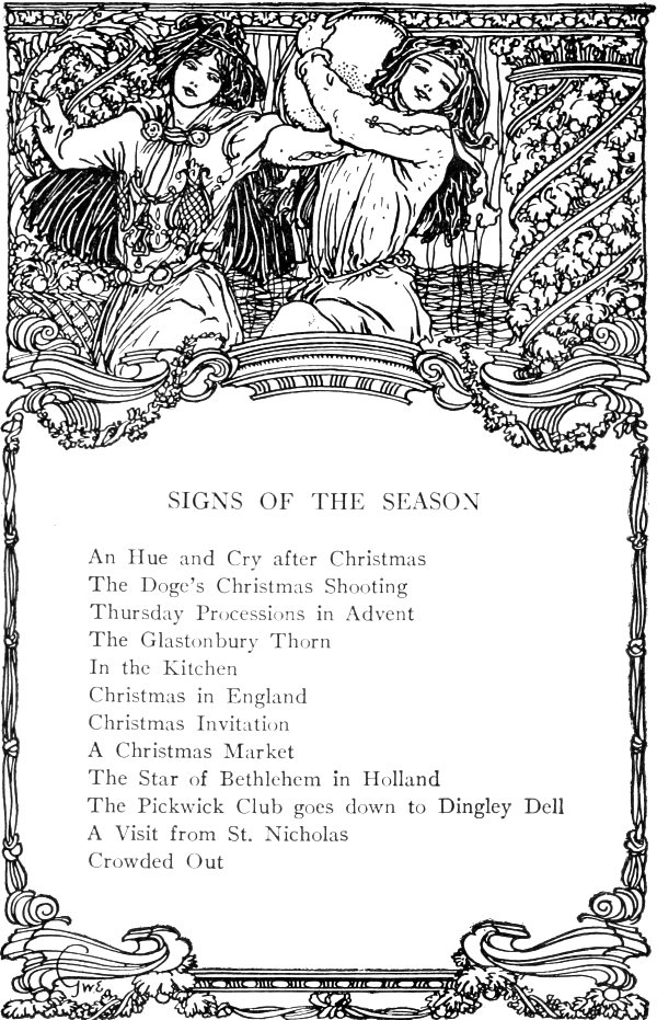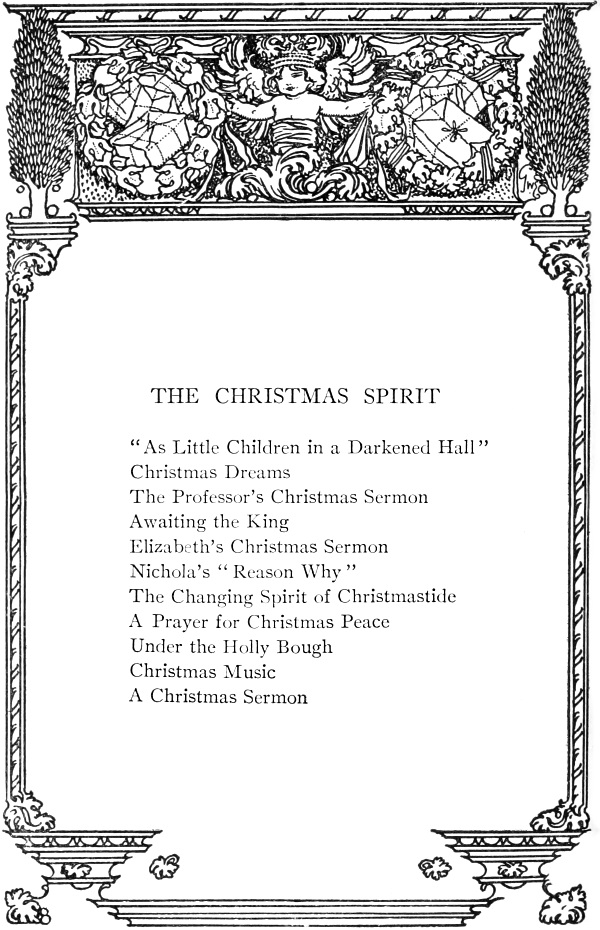 A Book of Christmas is a text-book of piety, friendship, merriment; a record of the real business of the race, which is not to make money, but to make life full and sweet and satisfying. It is a book to put into the hands of young men eager to start on the race and of young women to whom the future holds out a dazzling vision of a prosperity of pleasure and success; for it translates the word on all lips into its only comprehensible terms. In the glow of the Christmas fire the man who has made a fortune without making friends is a tragic failure, and the woman who has won the place and power she saw shining with delusive splendor on the far horizon and missed happiness faces one of life's bitterest ironies. It is a book for those who have fallen under the delusion that action is the only form of effective expression, and that to be useful one must rush along the road with the ruthless speed of an automobile; forgetting that action is only a path to being, and that the joy of life is largely found by the way. It is a book for those ardent spirits to whom the one interest in life is making people over and fitting them into their places in a rigid order of arbitrary goodness, forgetting that to the heart of a child the Kingdom of Heaven is always open, and the ultimate grace of it is the purity which is free and unconscious. It is a book for the sceptical and cynical, whose blighted sympathy and insight regain their vitality in the atmosphere of its love and kindness, its fun and frolic, its fellowship of loyal hearts and true.