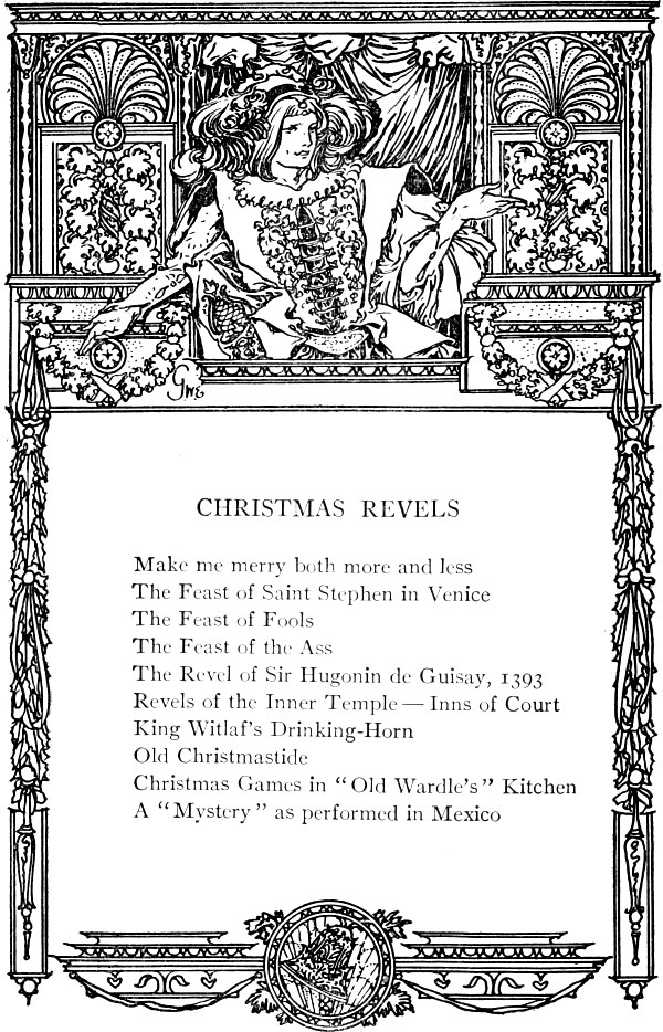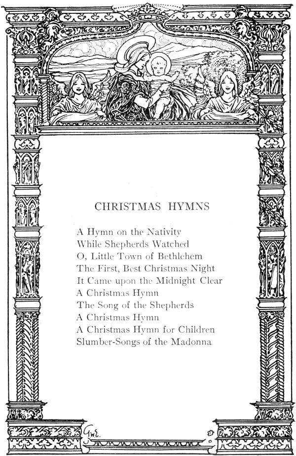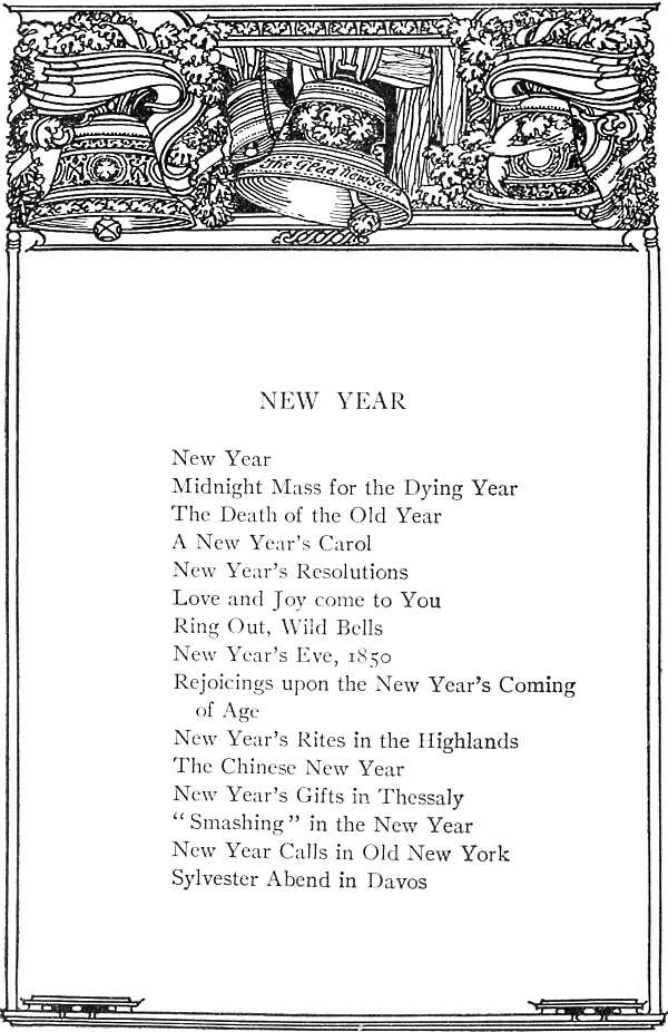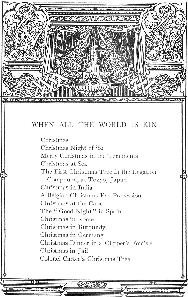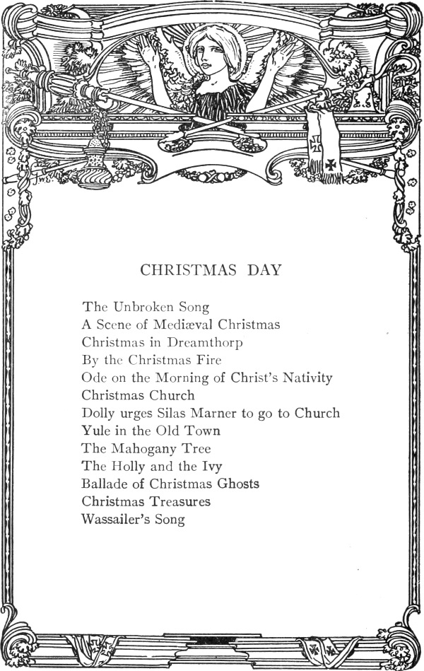 If Christmas is to be saved from desecration and kept sacred, not only to faith but to friendship, its sentiment must be revived year by year in the joyful celebration of the old rites. We have been so eager of late years to rid ourselves of superstition and "see things as they are," that we have lost that vision of the large relations of things in which alone their meaning and use is revealed. We have studied the field at our doorsteps so thoroughly that we have[Pg xi] lost sight of the landscape in which its little cup of fruitfulness is poured as into a great bowl rimmed by the horizon. One day out of three hundred and sixty-five, detached from its ancient history and isolated from the celebrations of centuries, cannot keep our hearts and hearths warm; we must rekindle the old fires and join hands with the vanished companies of friends who have kept the day and made it merry in the long ago. The echoes of ancient song and laughter give it a rich merriment, a ripe and tender wealth of associations. The mirth of one Christmas overflows into another until the sense of an unbroken joy, sinking and rising year after year like the tide of life in the fields, is borne in upon us. This sense of the unity of men in the great experiences steals back again into our hearts when we hear the old songs and read the old stories. Alexander Smith, whose book of essays, "Dreamthorp," is one of the books of the heart,—for there are books of the heart as well as books of knowledge and books of power,—kindled his imagination into a responsive glow by rereading every Christmas Day Milton's "Ode on the Morning of Christ's Nativity." When one opens the volume at this great song, it is like going into a church and hearing the organ played by unseen hands; the silence is flooded by a vast music which lifts the heart into the presence of great mysteries. But there is a time for private devotions as well as for public worship, for domestic as well as religious celebrations; and for every hour and place and mood there is a song and story. There are tender hymns for the devout, and spirited songs for those who celebrate together old days and ancient friendships; there are quaint carols for those whose hearts long for the quiet and pleasant ways of an olden time, and there are roaring catches for those whose gayety rises to the flood;[Pg xii] there are meditations for the solitary, and there are stories for the little groups about the fire.
