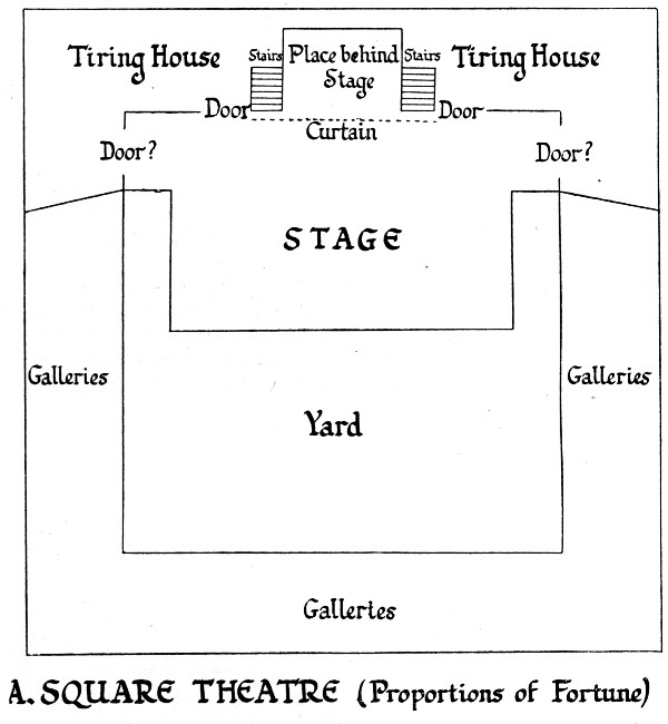 Of what nature, then, was the space so disclosed? There was ordinarily, as already stated, a narrow space behind an arras; and if the gallery above the stage jutted forward, or had, as the Swan drawing perhaps indicates, a projecting weather-board, this might be widened into a six- or seven-foot corridor, still in front of the back wall.[242] Such a corridor would, however, hardly give the effect of a chamber, although it might that of a portico. Nor would it be adequate in size to hold all the scenes which it is natural to class as chamber scenes; such, for example, as that in Tamburlaine, where no less than ten persons are discovered grouped around Zenocrate’s bed.[243] The stage-directions themselves do not help us much; that in Alphonsus alone names ‘the place behind the stage’, and as this is only required to contain the head of Mahomet, a corridor, in this particular scene, would have sufficed.[244] There is, however, no reason why the opening curtains should not have revealed a quite considerable aperture in the back wall, and an alcove or recess of quite considerable size lying behind this aperture. With a 43-foot stage, as at the Fortune, and doors placed rather nearer the ends of it than De Witt shows them, it would be possible to get a 15-foot aperture, and still leave room for the drawn curtains to hang between the aperture and the doors. Allow 3 feet for the strip of stage between arras and wall, and a back-run of 10 feet behind the wall, and you get an adequate chamber of 15 feet × 13 feet. My actual measurements are, of course, merely illustrative. There would be advantages, as regards vision, in not making the alcove too deep. The height, if the gallery over the stage ran in a line with the middle gallery for spectators, would be about 8 feet or 9 feet; rather low, I admit.[245] A critic may point out that behind the back wall of the outer stage lay the tire-house, and that the 14-foot deep framework of a theatre no greater in dimensions than the Fortune does not leave room for an inner stage in addition to the tire-house. I think the answer is that the ‘place behind the stage’ was in fact nothing but an enclave within the tire-house, that its walls consisted of nothing but screens covered with some more arras, that these were only put up when they were needed for some particular scene, and that[83] when they were up, although they extended to nearly the full depth of the tire-house, they did not occupy its full width, but left room on either side for the actors to crowd into, and for the stairs leading to the upper floors. When no interior scene had to be set, there was nothing between the tire-house and the outer stage but the curtains; and this renders quite intelligible the references quoted in an earlier chapter to actors peeping through a curtain at the audience, and to the audience ‘banding tile and pear’ against the curtains, to allure the actors forth.[246] I do not think it is necessary to assume that there was a third pair of folding doors permanently fixed in the aperture.[247] They would be big and clumsy, although no doubt they would help to keep out noise. In any case, there is not much evidence on the point. If Tarlton’s head was seen ‘the Tire-House doore and tapistrie betweene’, he may very well have gone to the end of the narrow passage behind the arras, and looked out where that was broken by one of the side-doors. No doubt, however, the aperture is the third place of entrance ‘in the midst’, which the stage-directions or action of some plays require, and which, as such, came to be regarded as a third door.[248]