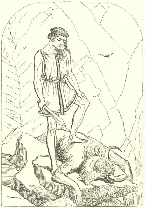 And at last Theseus came up with him, where he lay panting on a slab among the snow, and caught him by the horns, and forced his head back, and drove the keen sword through his throat.