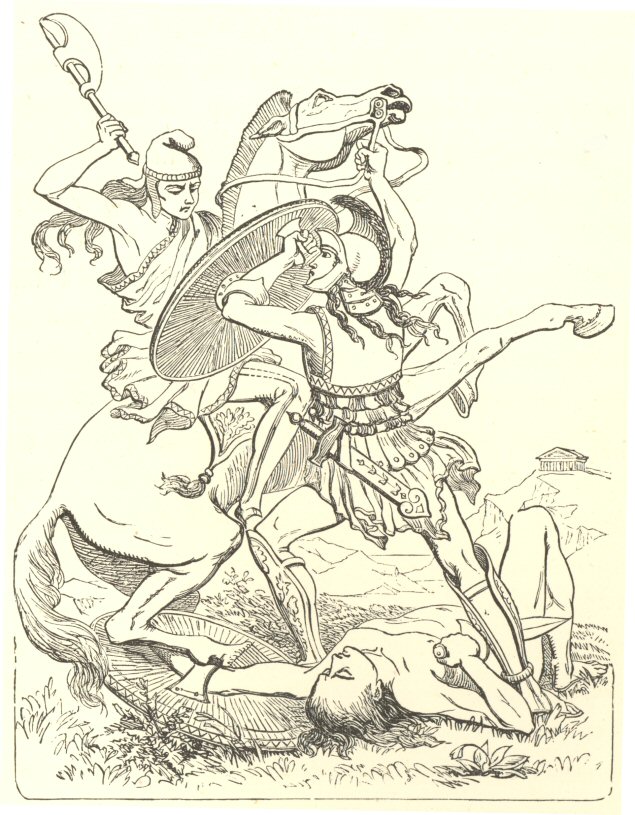But Theseus stept aside nimbly, and as he passed by, cut him in the knee; and ere he could turn in the narrow path, he followed him, and stabbed him again and again from behind, till the monster fled bellowing wildly; for he never before had felt a wound. And Theseus followed him at full speed, holding the clue of thread in his left hand.