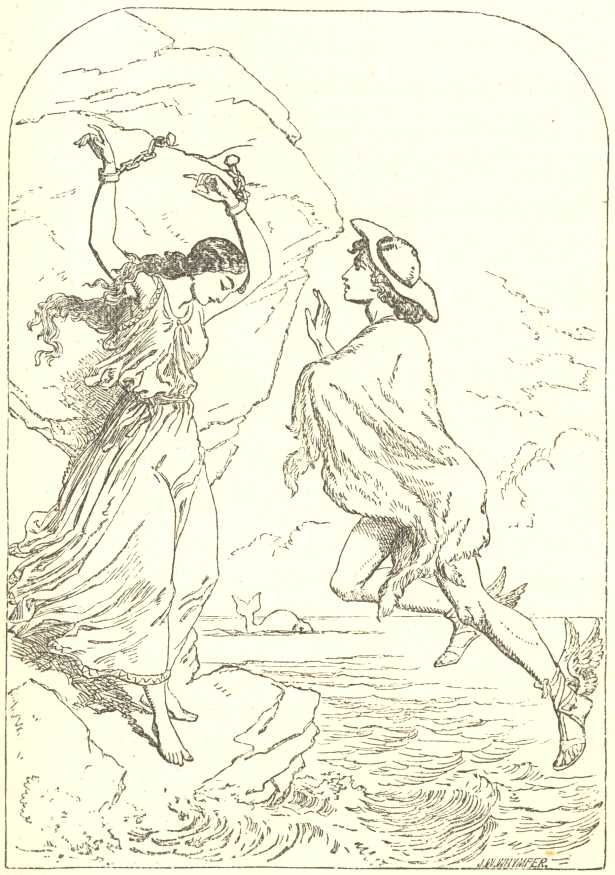 After a while she was awakened suddenly; for the chest was jarring and grinding, and the air was full of sound. She looked up, and over her head were mighty cliffs, all red in the setting sun, and around her rocks and breakers, and flying flakes of foam. She clasped her hands together, and shrieked aloud for help. And when she cried, help met her: for now there came over the rocks a tall and stately man, and looked down wondering upon poor Danae tossing about in the chest among the waves.