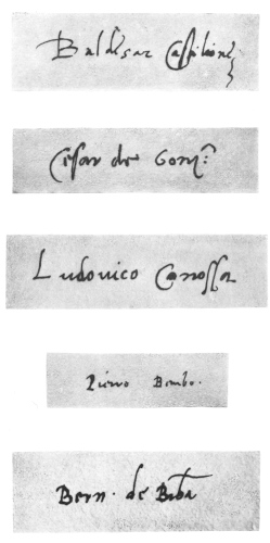 The few deviations that the present translator has ventured to make from the letter of the Italian text are merely verbal, and were deemed needful to render its meaning clear. The notes that he offers are intended to explain obscure passages and to relieve the reader from the tedium of searching in books of reference. Perhaps no one will regard it as inopportune to be reminded of what all may have known but few are able to remember with precision. Students who may wish to learn from what Greek and Latin sources Castiglione derived material are referred to Professor Vittorio Cian’s admirable edition.