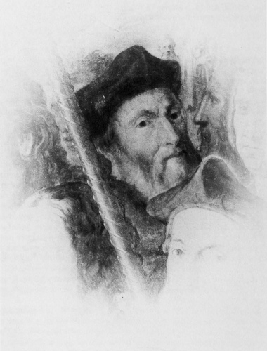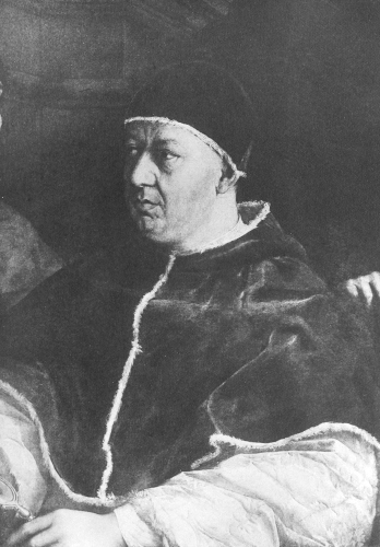 Reduced from Braun’s photograph (no. 11.505) of the portrait in the Louvre, painted in 1516 by Raphael (1483-1520). The original belonged to Charles I of England, after whose death it was bought by a Dutch collector and copied by Rubens. Later it became the property of Cardinal Mazarin, from whose heirs it was acquired for Louis XIV of France.