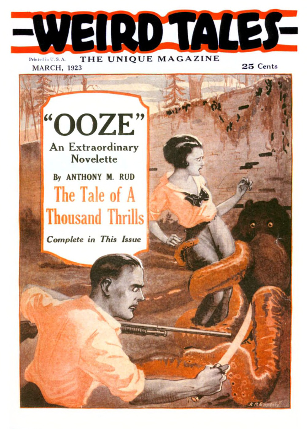 WEIRD TALES offers such fiction as you can find in no other magazine—fantastic stories, extraordinary stories, grotesque stories, stories of strange and bizarre adventure—the sort of stories, in brief, that will startle and amaze you. Every story in this issue of WEIRD TALES is an odd and remarkable flight of man’s imagination. Some are “creepy,” some deal in masterly fashion with “forbidden” subjects, like insanity, some are concerned with the supernatural and others with material things of horror—all are out of the ordinary, surprisingly new and unusual. A sensational departure from the beaten track—that is the reason for