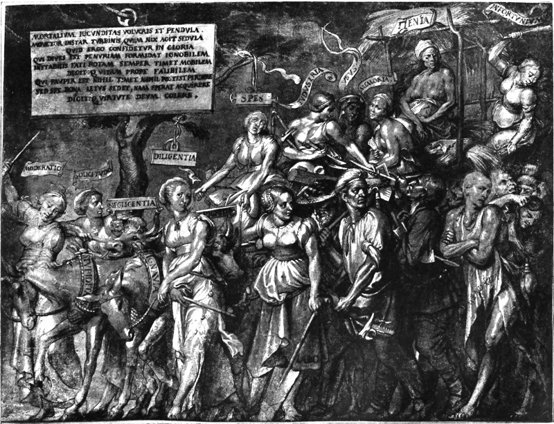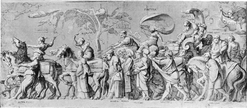| 7. | THE TRIUMPH OF POVERTY Seventeenth-century copy, by Jan de Bisschop, of the wall-decoration in the Guildhall of the London Steelyard Merchants. British Museum. |