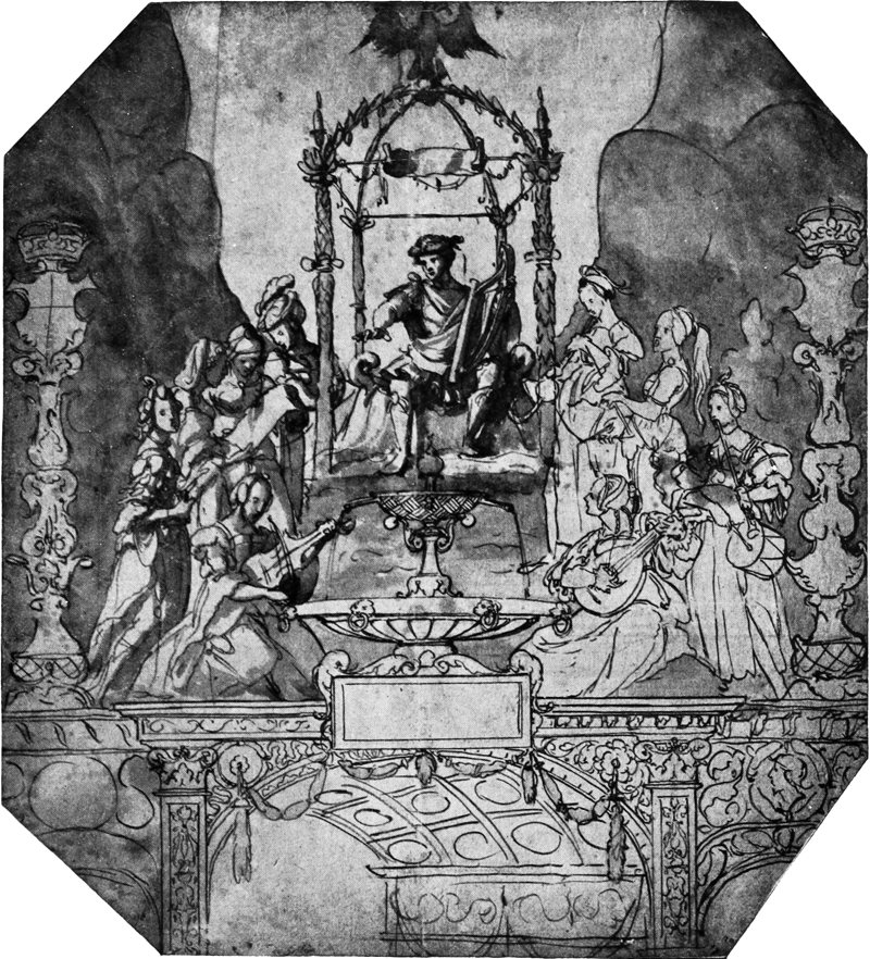 | 8. | APOLLO AND THE MUSES Design for the decoration of the Steelyard on the occasion of the coronation of Anne Boleyn. Pen-and-wash drawing touched with green. Royal Print Room, Berlin. |