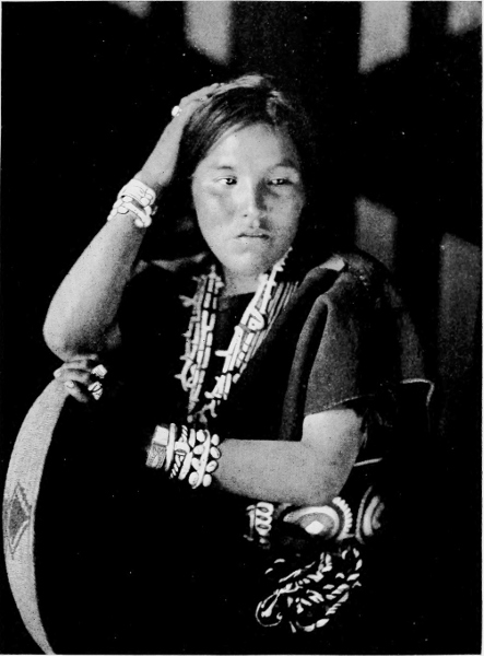 She wears two gold rings, one set with a turquoise, the other with coral. The peculiar crown of gold, turquoise and coral is that adopted for the queens of Sikkim. From the necklace of amber beads hangs a gau, or charm box, set with rubies, lapis-lazuli, and turquoise.