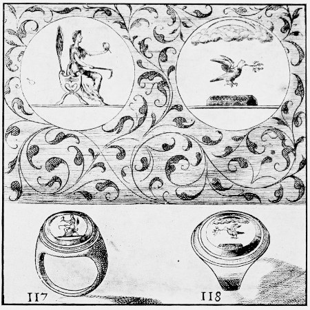 The illustrations of rings in the British Museum are mostly from one or the other of the two exceedingly comprehensive catalogues of rings published by this museum: “Finger Rings, Greek, Etruscan and Roman,” by F. H. Marshall, and “Finger Rings, Early Christian, Byzantine, Teutonic, Mediæval, and Later,” by O. M. Dalton. In each volume the section devoted to a special description of each ring is preceded by a most scholarly and enlightening introductory essay.