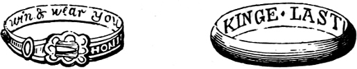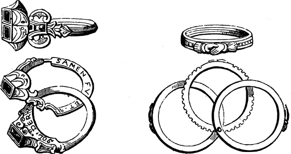 Closely connected with these religious rings, are the betrothal and wedding rings. Here it has seemed best to group together the available data, since the line of demarcation between engagement and wedding rings, though clearly enough marked to-day, is not easy to draw in regard to earlier times. A very full selection of mottoes has been added, some of which might still be used; the greater number, however, belong to a past age, upon the sentiments of which they cast interesting side lights.