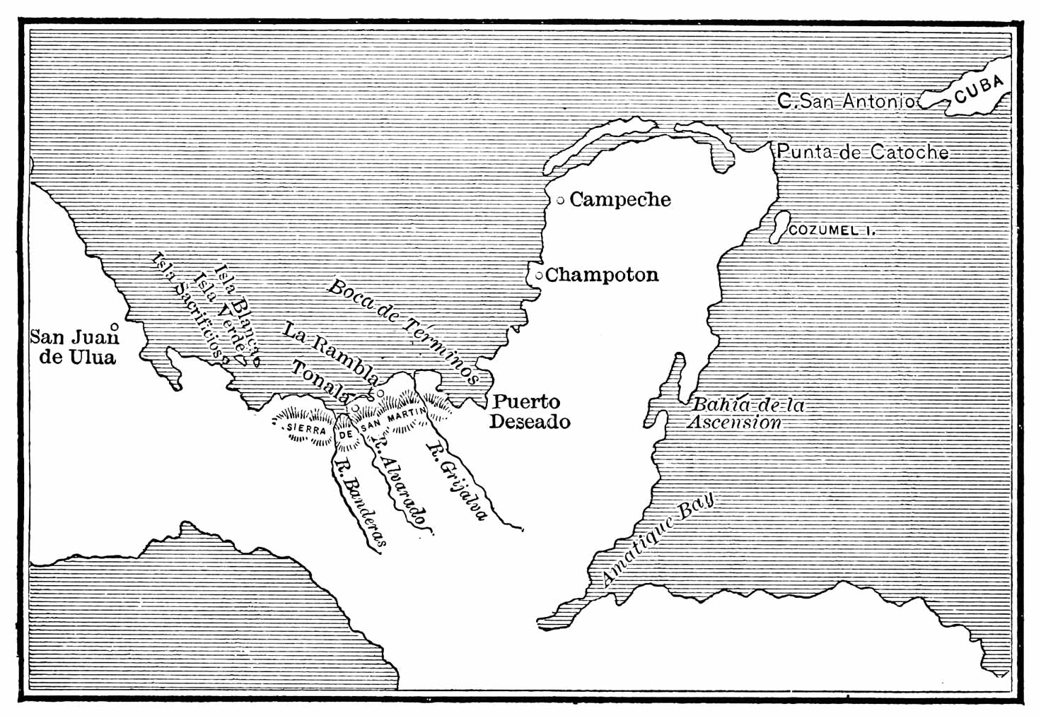 | Velazquez Plans a New Expedition—Gives the Command to his Nephew, Juan de Grijalva—Who Embarks at Santiago and Strikes the Continent at Cozumel Island—Coasts Southward to Ascension Bay—Then Turns and Doubles Cape Catoche—Naming of New Spain—Fight at Champoton—Arrival at Laguna de Términos—Alaminos, the Pilot, is Satisfied that Yucatan is an Island—They Coast Westward and Discover the Rivers San Pedro y San Pablo and Tabasco—Notable Interview at this Place between the Europeans and the Americans—The Culhua Country—They Pass La Rambla, Tonalá, the Rio Goazacoalco, the Mountain of San Martin, the Rivers of Alvarado and Banderas, and Come to the Islands of Sacrificios and San Juan de Ulua | 15 |