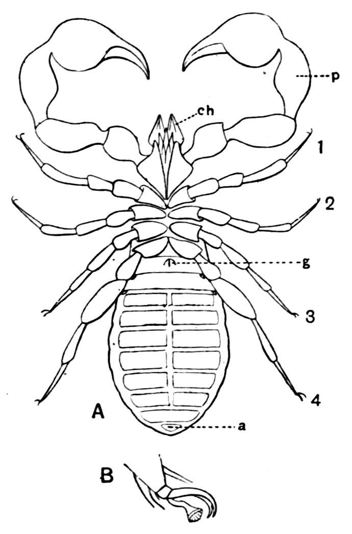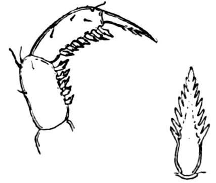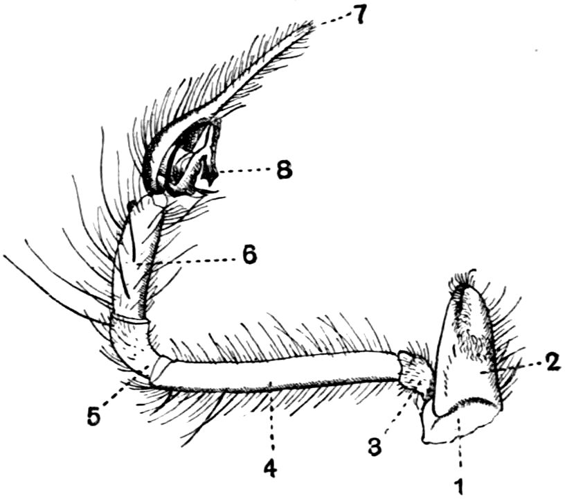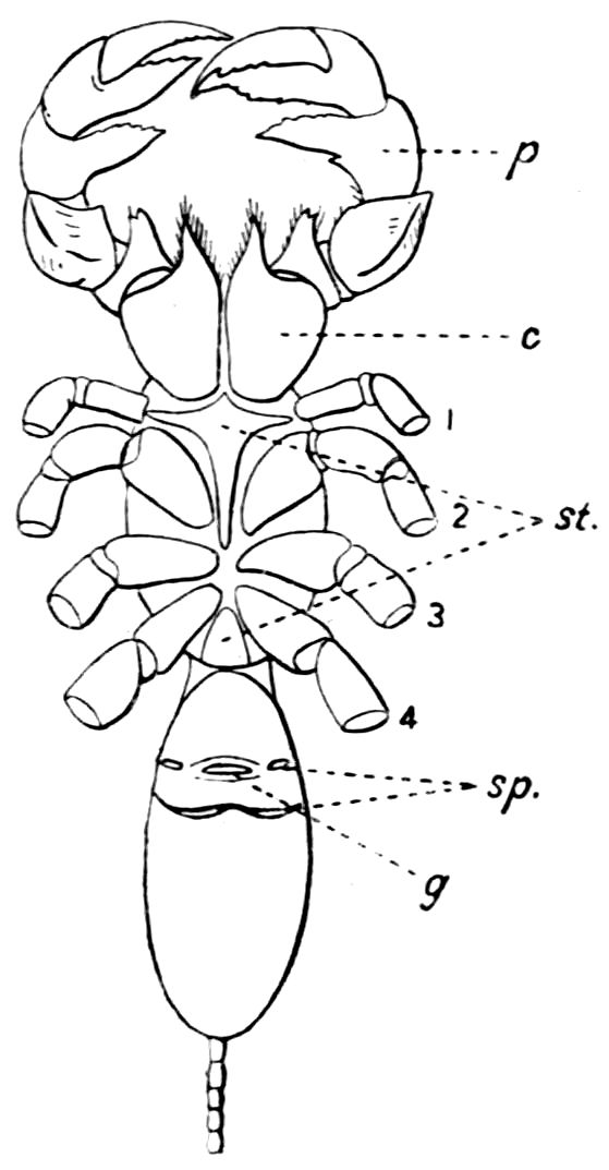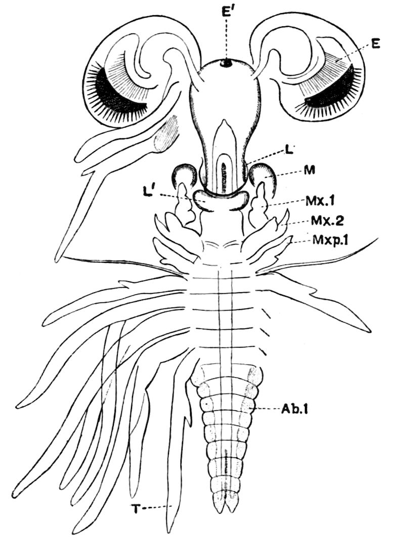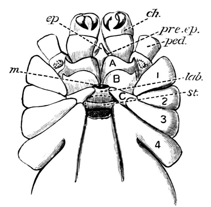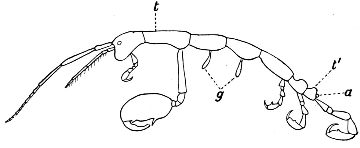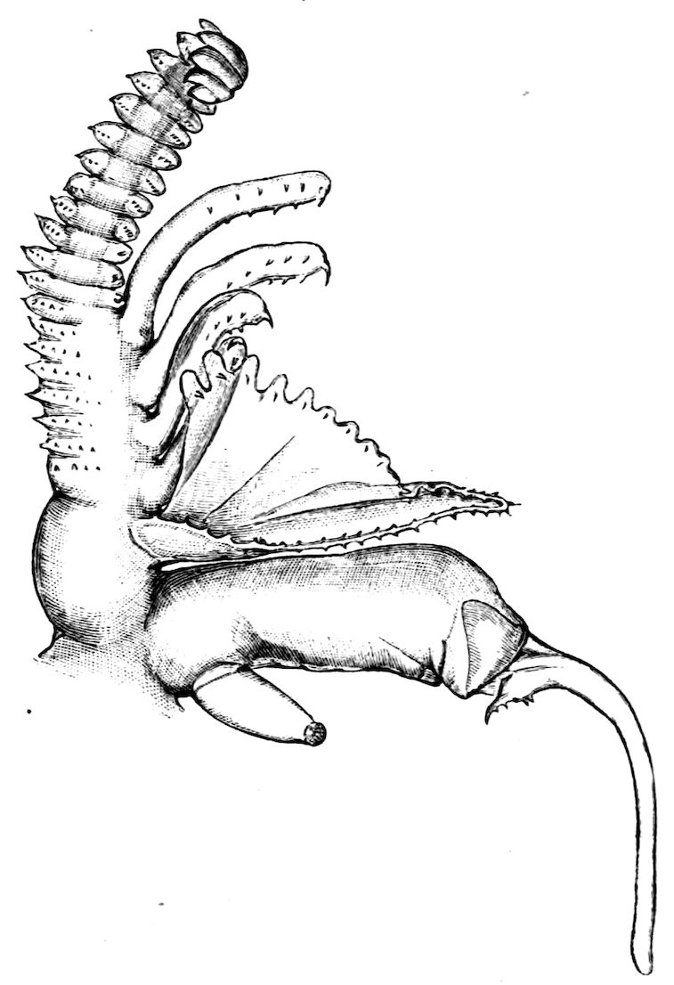 426. The chelate form of the foremost appendages is of little moment. A chela consists merely of a more or less mobile terminal joint flexing on a more or less protuberant penultimate one, and in the Scorpions, in Limulus, throughout the Crustacea, and even in Insects (cf. vol. vi. p. 554), we see such a structure arising independently on very diverse appendages.