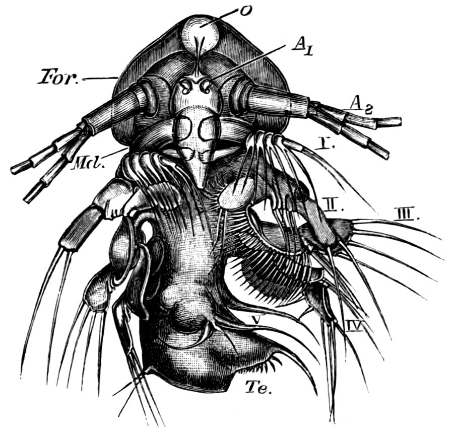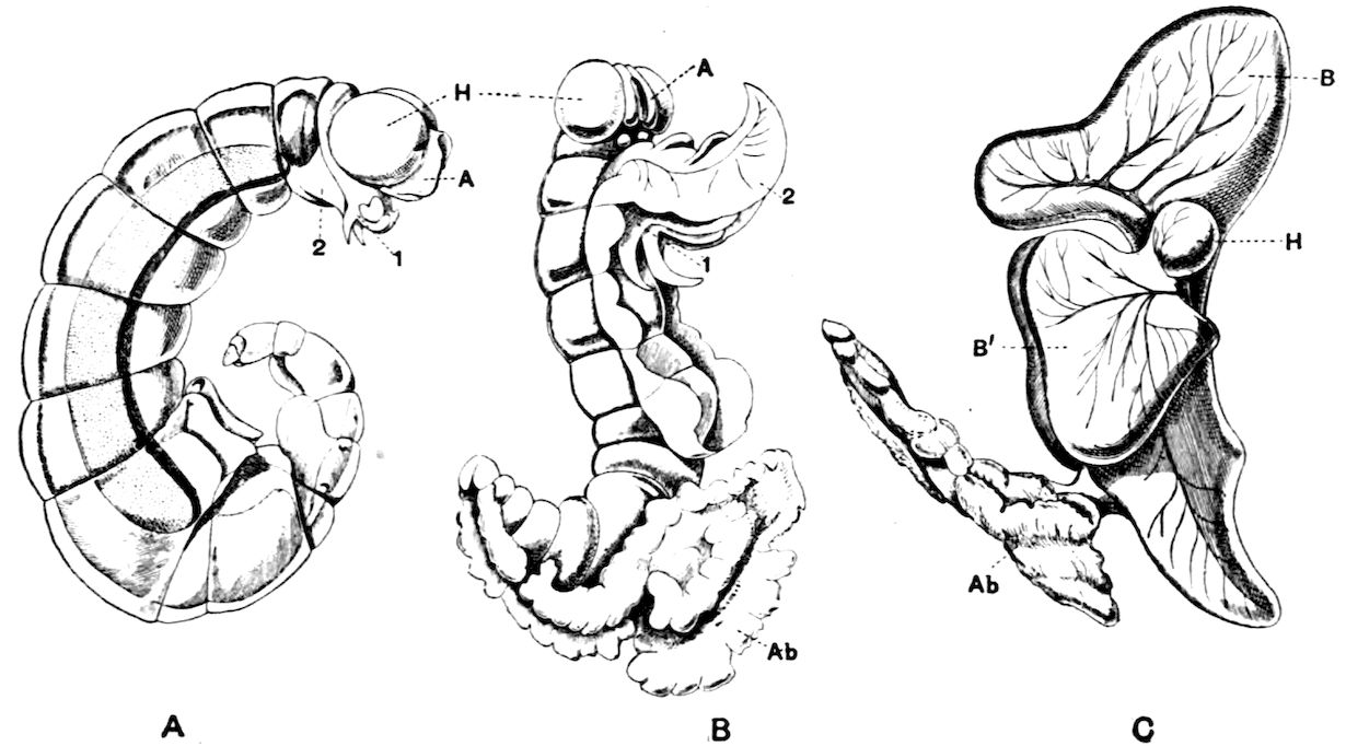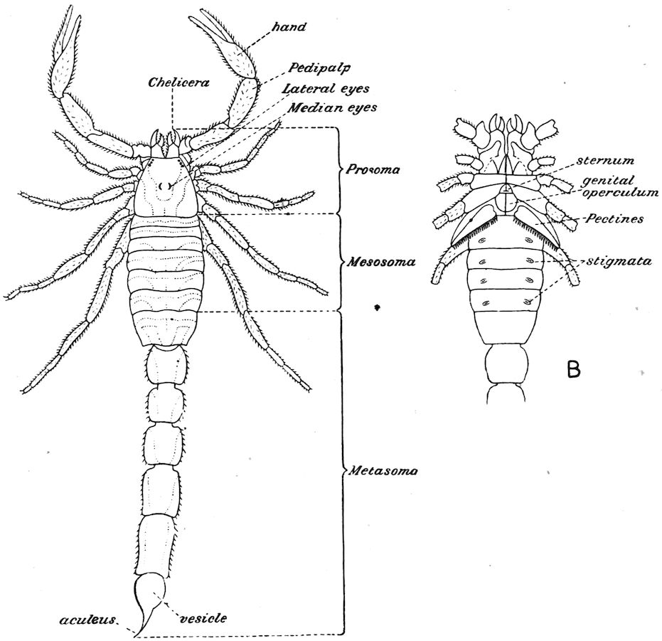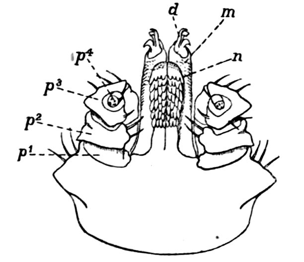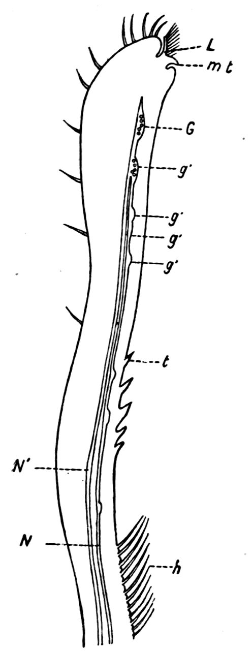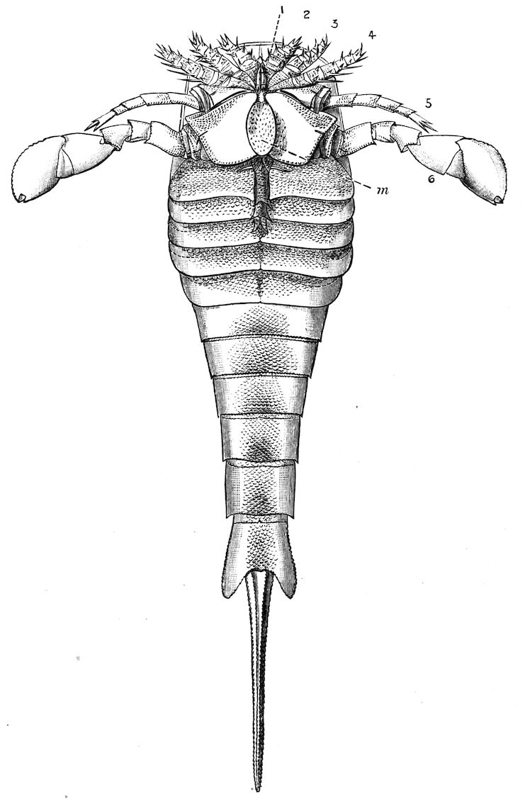 426. The chelate form of the foremost appendages is of little moment. A chela consists merely of a more or less mobile terminal joint flexing on a more or less protuberant penultimate one, and in the Scorpions, in Limulus, throughout the Crustacea, and even in Insects (cf. vol. vi. p. 554), we see such a structure arising independently on very diverse appendages.