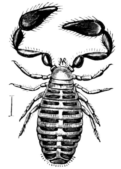 Brünnich’s description (“Entomologia,” 1764), is still more accurate, and is worthy of transcription as an excellent example of early work. “Fig. iv. Novum genus, a R[ev.] D[on.] Ström inter phalangiis relatum, Söndm. Tom. i. p. 209, t. 1, f. 17. Exemplar hujus insecti, quod munificentia R. Autoris possideo, ita describo; Caput cum thorace unitum, tubo b excavato cylindrico, antice angustiore, postice in thoracem recepto, prominens; Oculi iv. dorsales, a, in gibbositate thoracis positi; c, Antennae 2 tubo breviores moniliformes, subtus in segmento thoracis, cui oculi insident, radicatae; segmenta corporis, excepto tubo, iv., cum tuberculo e medio singuli segmenti prominulo. Pedes viii., singuli ex articulis vii. brevissimis compositi, ungue valido terminati. Ex descriptione patet insectum hoc a generibus antea notis omnino differre, ideoque novum genus, quod e crebris articulationibus Pycnogonum dico, constituit.” The confusion between Cyamus and Pycnogonum seems to have arisen with Job Baster, 1765; cf. Stebbing, Knowledge, February 1902, and Challenger Reports, “Amphipods,” 1888, pp. 28, 30, etc.