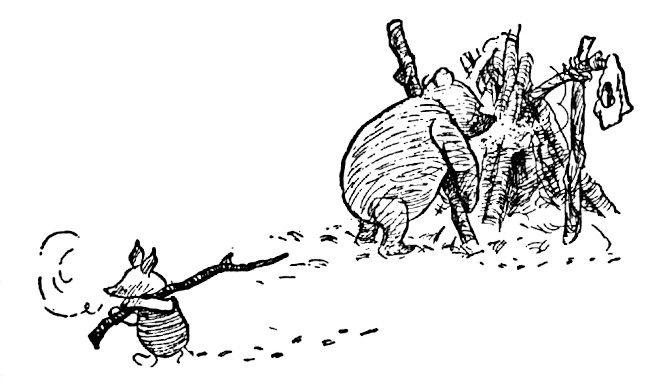 "Of course he could!" said Christopher Robin. "I'll make you one." And he took a stick and touched Pooh on the shoulder, and said, "Rise, Sir Pooh de Bear, most faithful of all my Knights."
