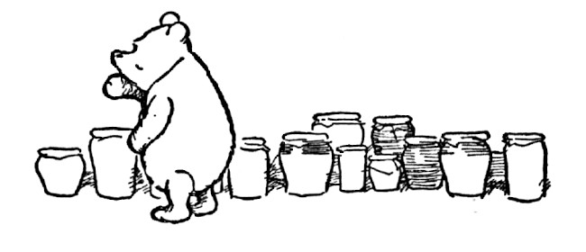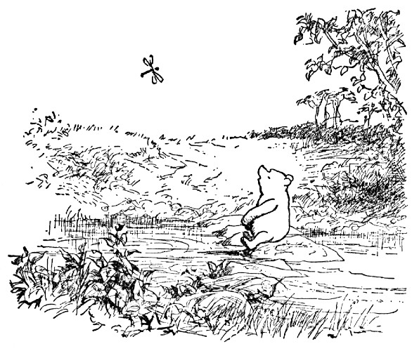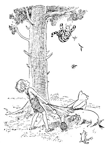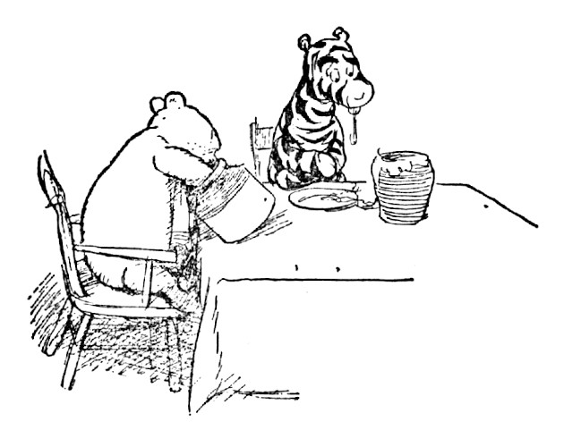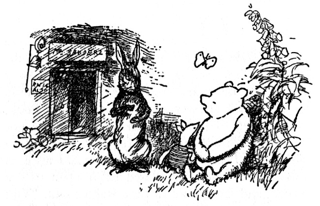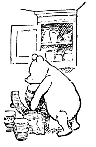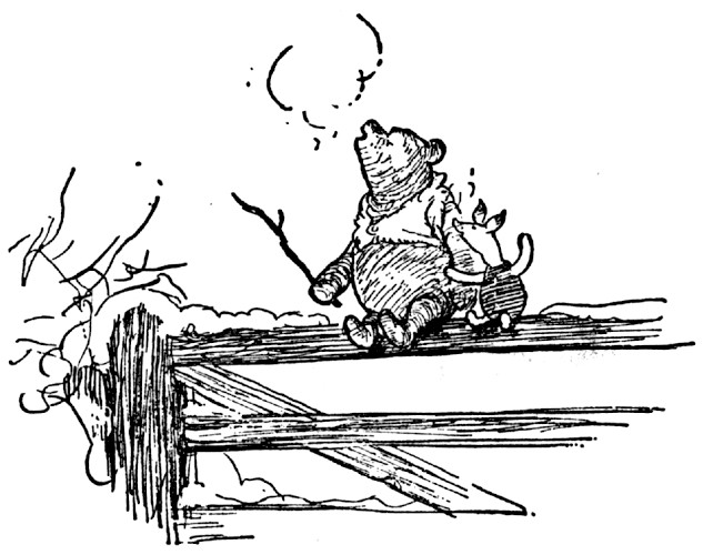 "Well," said Pooh, "what I like best——" and then he had to stop and think. Because although Eating Honey was a very good thing to do, there was a moment just before you began to eat it which was better than when you were, but he didn't know what it was called. And then he thought that being with Christopher Robin was a very good thing to do, and having Piglet near was a very friendly thing to have; and so, when he had thought it all out, he said, "What I like best in the whole world is Me and Piglet going to see You, and You saying 'What about a little something?' and Me saying, 'Well, I shouldn't mind a little something, should you, Piglet,' and it being a hummy sort of day outside, and birds singing."