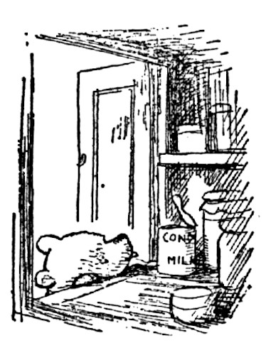 "Nearly eleven o'clock," said Pooh happily. "You're just in time for a little smackerel of something," and he put his head into the cupboard. "And then we'll go out, Piglet, and sing my song to Eeyore."