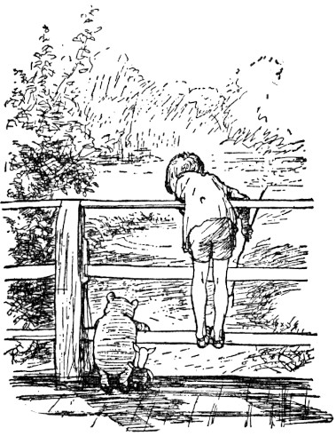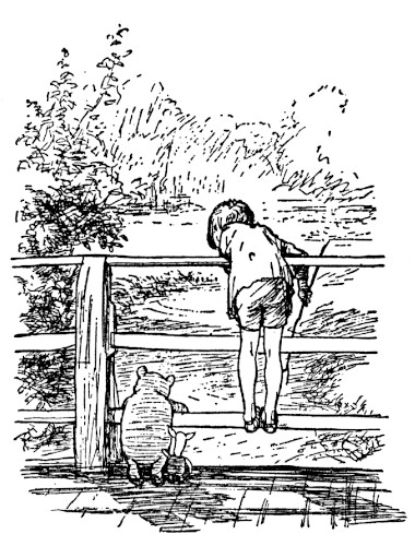 Then, suddenly again, Christopher Robin, who was still looking at the world, with his chin in his hands, called out "Pooh!"