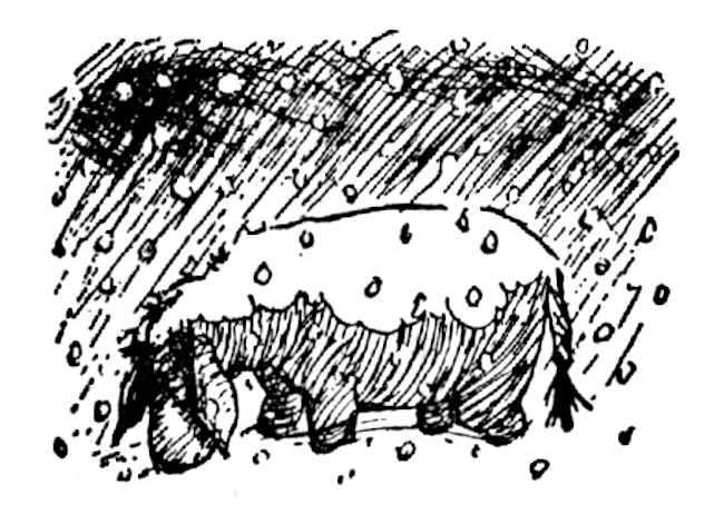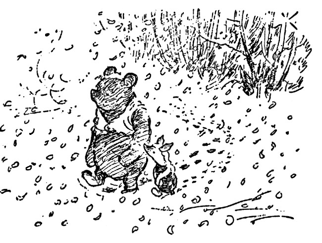 The clock was still saying five minutes to eleven when Pooh and Piglet set out on their way half an hour later. The wind had dropped, and the snow, tired of rushing round in circles trying to catch itself up, now fluttered gently down until it found a place on which to rest, and sometimes the place was Pooh's nose and sometimes it wasn't, and in a little while Piglet was wearing a white muffler round his neck and feeling more snowy behind the ears than he had ever felt before.