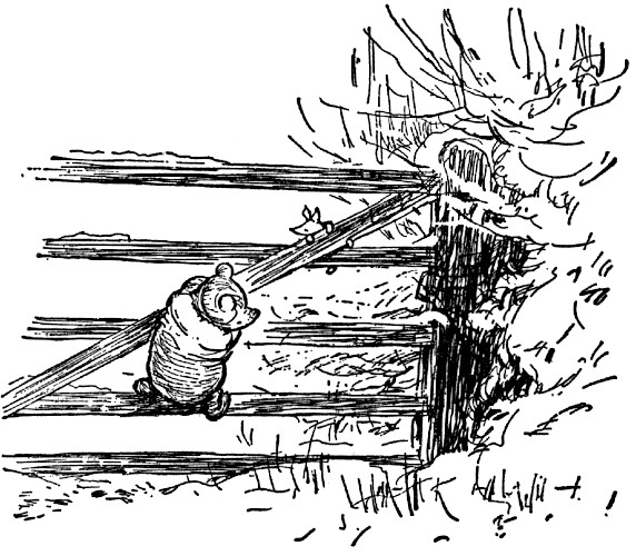 By this time they were getting near Eeyore's Gloomy Place, which was where he lived, and as it was still very snowy behind Piglet's ears, and he was getting tired of it, they turned into a little pine wood, and sat down on the gate which led into it. They were out of the snow now, but it was very cold, and to keep themselves warm they sang Pooh's song right through six times, Piglet doing the tiddely-poms and Pooh doing the rest of it, and both of them thumping on the top of the gate with pieces of stick at the proper places. And in a little while they felt much warmer, and were able to talk again.