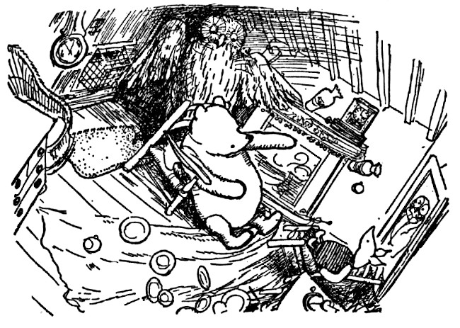 He hurried back to his own house; and his mind was so busy on the way with the hum that he was getting ready for Eeyore that, when he suddenly saw Piglet sitting in his best arm-chair, he could only stand there rubbing his head and wondering whose house he was in.