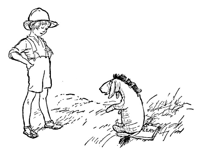 Christopher Robin had spent the morning indoors going to Africa and back, and he had just got off the boat and was wondering what it was like outside, when who should come knocking at the door but Eeyore.