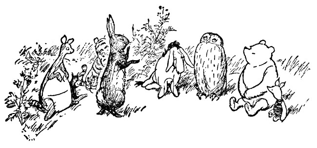 "Christopher Robin," he said, "we've come to say—to give you—it's called—written by—but we've all—because we've heard, I mean we all know—well, you see, it's—we—you—well, that, to put it as shortly as possible, is what it is." He turned round angrily on the others and said, "Everybody crowds round so in this Forest. There's no Space. I never saw a more Spreading lot of animals in my life, and all in the wrong places. Can't you see that Christopher Robin wants to be alone? I'm going." And he humped off.