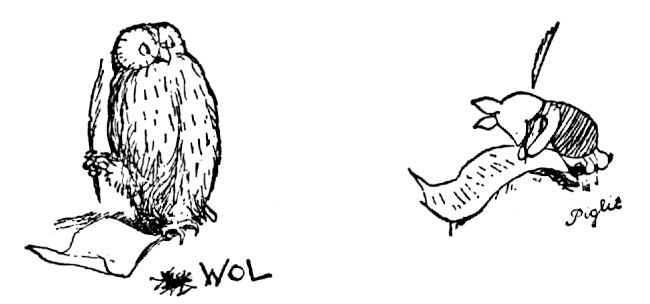 So it was signed POOH, PIGLET, WOL, EOR, RABBIT, KANGA, BLOT, SMUDGE, and they all went off to Christopher Robin's house with it.
