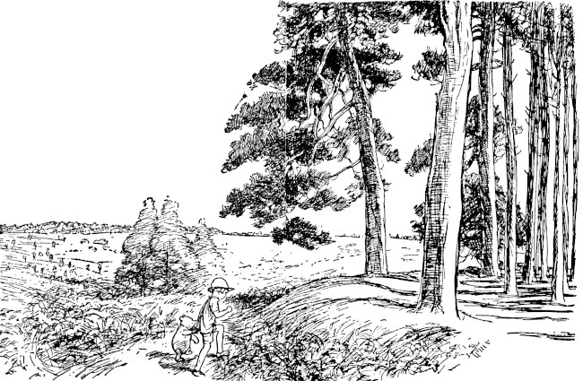 They walked on, thinking of This and That, and by-and-by they came to an enchanted place on the very top of the Forest called Galleons Lap, which is sixty-something trees in a circle; and Christopher Robin knew that it was enchanted because nobody had ever been able to count whether it was sixty-three or sixty-four, not even when he tied a piece of string round each tree after he had counted it. Being enchanted, its floor was not like the floor of the Forest, gorse and bracken and heather, but close-set grass, quiet and smooth and green. It was the only place in the Forest where you could sit down carelessly, without getting up again almost at once and looking for somewhere else. Sitting there they could see the whole world spread out until it reached the sky, and whatever there was all the world over was with them in Galleons Lap.