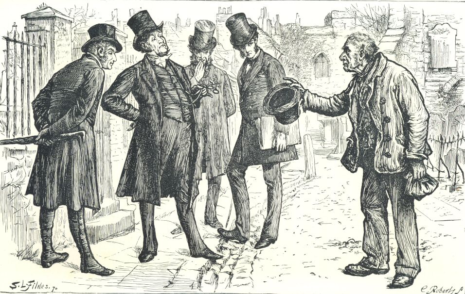 Again, the same whiskerless young man, bounding up the spiral staircase in daylight, and wildly pointing upwards, is taken by Mr. Cuming Walters to represent Jasper climbing the staircase to reconnoitre, at night, with a lantern, and, of course, with black whiskers. The two well-dressed men on the stairs (Grewgious, or Tartar, and Crisparkle) also, according to Mr. Cuming Walters, “relate to Jasper’s unaccountable expedition with Durdles to the Cathedral.” Neither of them is Jasper; neither of them is Durdles, “in a suit of coarse flannel”—a disreputable jacket, as Sir L. Fildes depicts him—“with horn buttons,” and a battered old tall hat. These interpretations are quite demonstrably erroneous and even impossible. Mr. Archer interprets the designs exactly as I do.