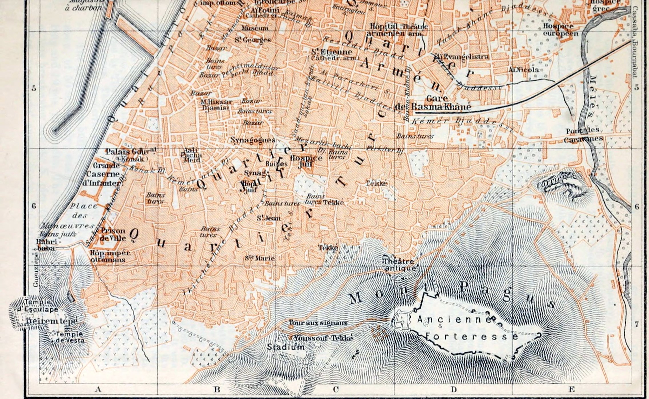 Hotels. Pens. Marengo (Pl. b; B, 1), on the E. hill, with fine views, well spoken of; Hôt. Suisse (Pl. a; B, 1), on the Hurriyet Meïdan; pens. in both 6–10 fr.