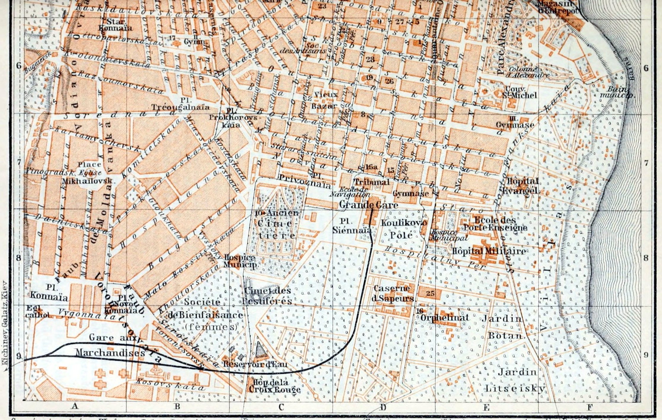 Odessa.—Arrival by Sea. The examination of passports and luggage, which not even the passenger bound for more distant places escapes, occupies a considerable time. If the steamer is not berthed at the quay passengers are landed by small boat (40 copecks, with baggage 50 cop.; in stormy weather 60–75 cop.) at the Platonovsky Mole (Pl. E, 4, 5). Passengers going straight on by railway should take a cab direct to the main railway-station (70 cop., with pair 1 roub. 40 cop., incl. luggage; see p. 565).