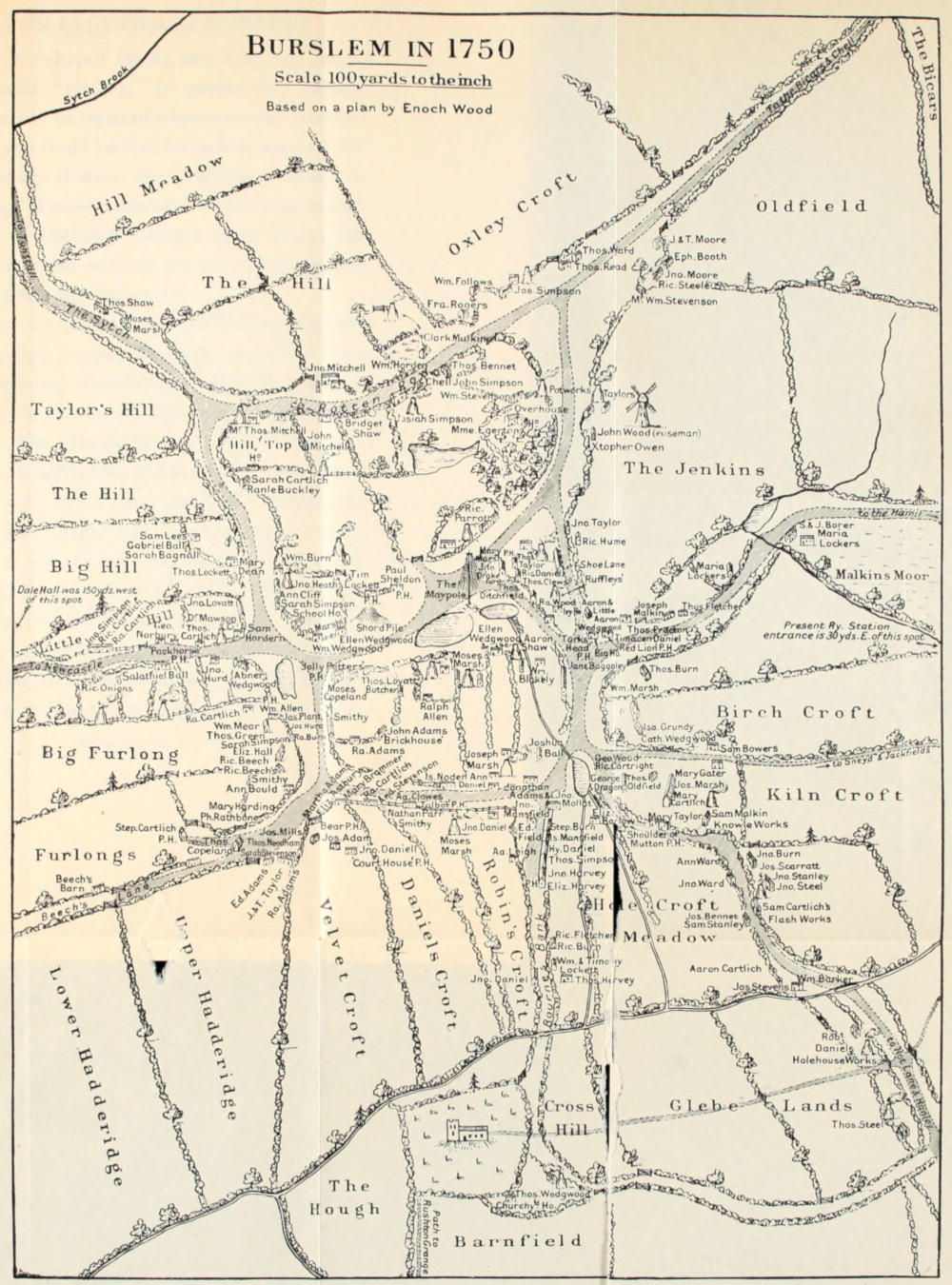 The reason is not that the district is or ever was given over entirely to pot-banks. Potting was incidental, a pastime in the middle of agriculture; as potting grew, so coal and iron mining grew too. The district is less confined to potting than Walsall to saddlery or Sheffield to knives. Even a thirteenth century reference to Walsall will expose harness; it is difficult to trace pots in the Potteries before 1650; you find only bloom-smithies and sea-coal mines. Potting is neither so ancient here, nor so exclusive as to have made the name. The real reason of the place-name, the Potteries, is that[2] no man who valued time could say Tunstall, Burslem, Hanley, Stoke and Longton, whenever he wanted to refer to one place—the place where men made pots—and few people outside the five towns ever wanted to speak of them separately, or could even distinguish one from others.
