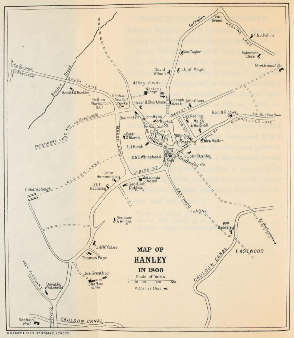 The area where pots were made in North Staffordshire has always been peculiarly local and circumscribed. It extends, and extended, in a line from Golden Hill to Meir Lane End. Occasionally, at times, we hear of Pot-works at Red—or Ridge—Street, at Bagnal or at Bucknall, outside this narrow area. They only receded finally from Chesterton during the last century. But, generally speaking, Staffordshire potters have persisted always in making pots just where their fathers made them before, in the hilly land between the Foulhay Brook and the sources of the Trent.