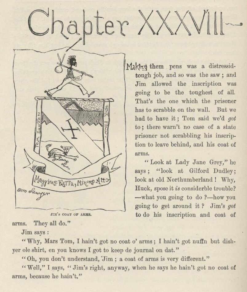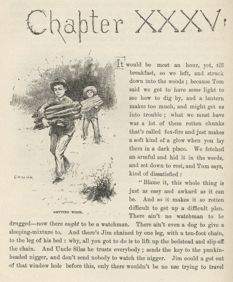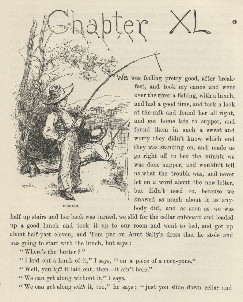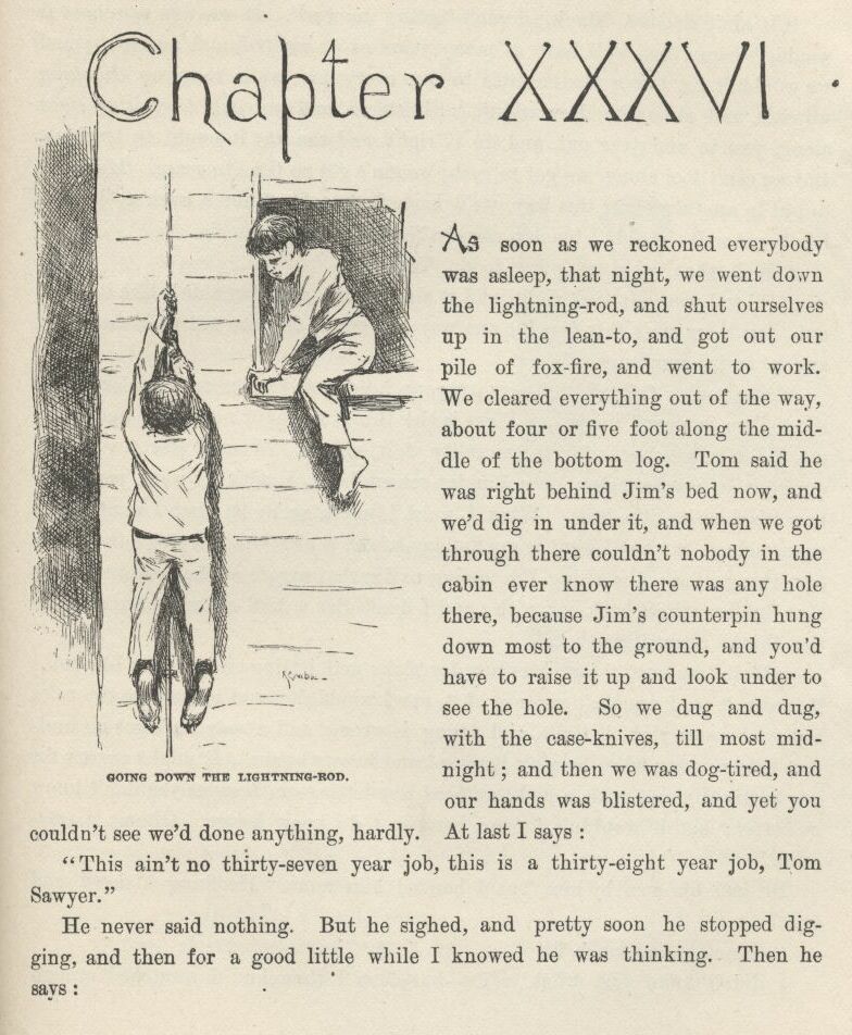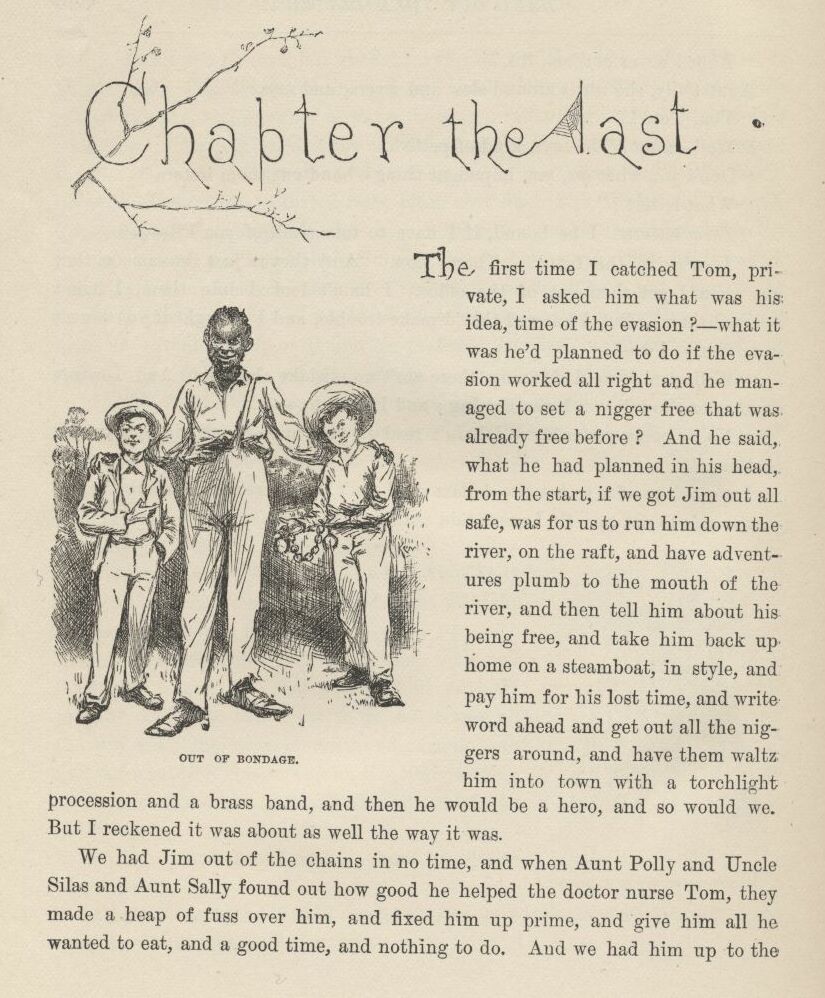 The first time I catched Tom private I asked him what was his idea, time of the evasion?—what it was he’d planned to do if the evasion worked all right and he managed to set a nigger free that was already free before? And he said, what he had planned in his head from the start, if we got Jim out all safe, was for us to run him down the river on the raft, and have adventures plumb to the mouth of the river, and then tell him about his being free, and take him back up home on a steamboat, in style, and pay him for his lost time, and write word ahead and get out all the niggers around, and have them waltz him into town with a torchlight procession and a brass-band, and then he would be a hero, and so would we. But I reckoned it was about as well the way it was.