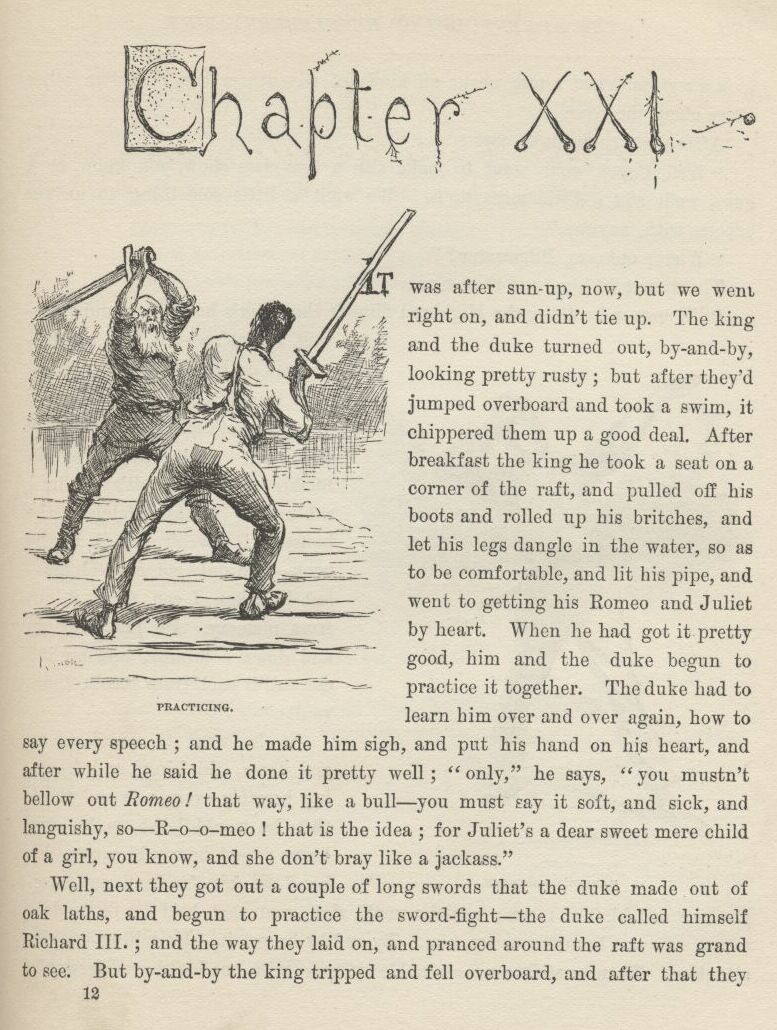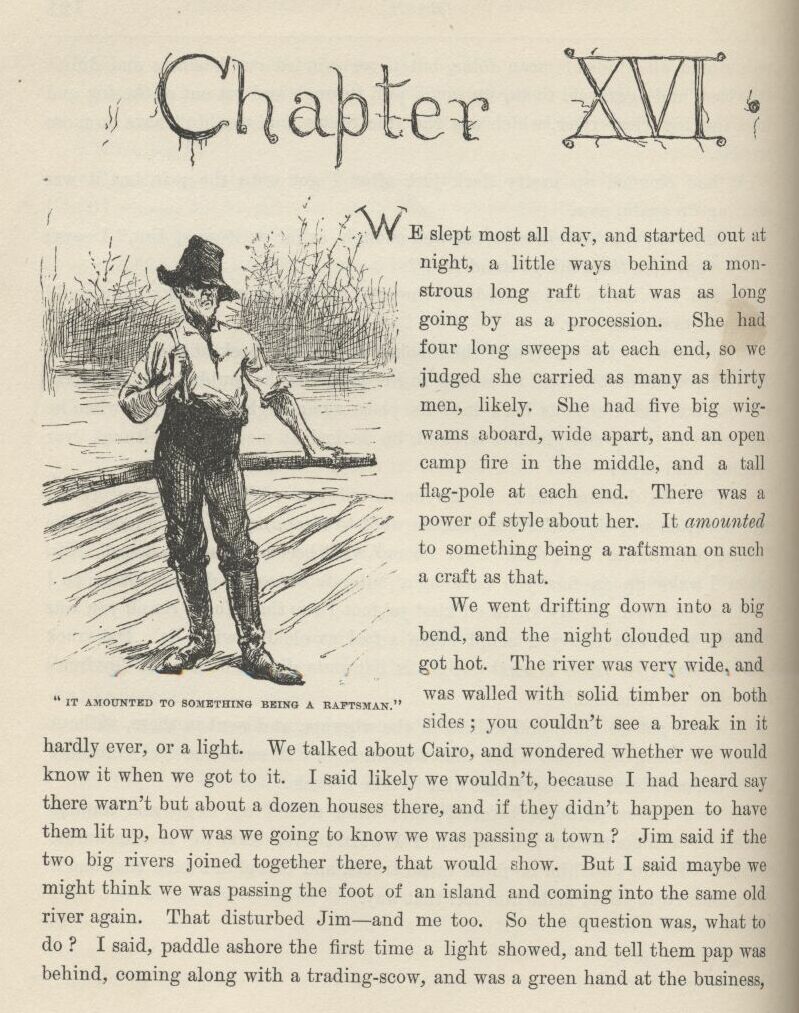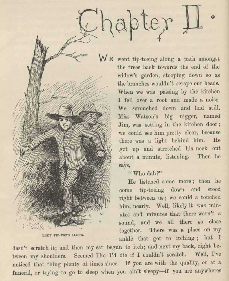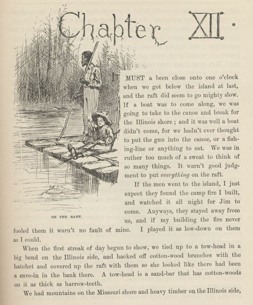 The first time I catched Tom private I asked him what was his idea, time of the evasion?—what it was he’d planned to do if the evasion worked all right and he managed to set a nigger free that was already free before? And he said, what he had planned in his head from the start, if we got Jim out all safe, was for us to run him down the river on the raft, and have adventures plumb to the mouth of the river, and then tell him about his being free, and take him back up home on a steamboat, in style, and pay him for his lost time, and write word ahead and get out all the niggers around, and have them waltz him into town with a torchlight procession and a brass-band, and then he would be a hero, and so would we. But I reckoned it was about as well the way it was.